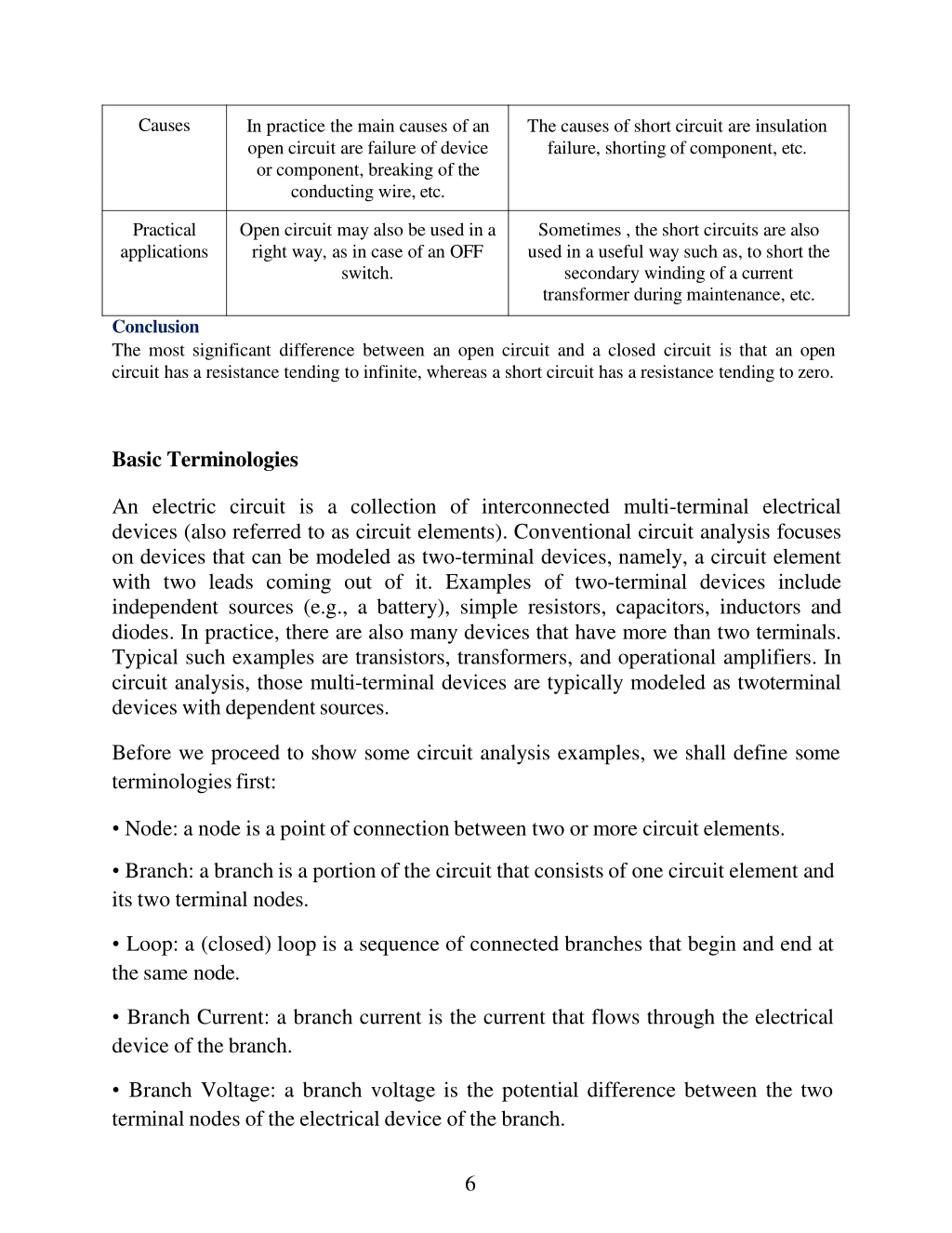 Causes In practice the main causes of an open circuit are failure of device or component, breaking of the conducting wire, etc. The causes of short circuit are insulation failure, shorting of component, etc. Practical applications Open circuit may also be used in a right way, as in case of an OFF switch. Sometimes , the short circuits are also used in a useful way such as, to short the secondary winding of a current transformer during maintenance, etc. Conclusion The most significant difference between an open circuit and a closed circuit is that an open circuit has a resistance tending to infinite, whereas a short circuit has a resistance tending to zero. Basic Terminologies An electric circuit is a collection of interconnected multi-terminal electrical devices (also referred to as circuit elements). Conventional circuit analysis focuses on devices that can be modeled as two-terminal devices, namely, a circuit element with two leads coming out of it. Examples of two-terminal devices include independent sources (e.g., a battery), simple resistors, capacitors, inductors and diodes. In practice, there are also many devices that have more than two terminals. Typical such examples are transistors, transformers, and operational amplifiers. In circuit analysis, those multi-terminal devices are typically modeled as twoterminal devices with dependent sources. Before we proceed to show some circuit analysis examples, we shall define some terminologies first: Node: a node is a point of connection between two or more circuit elements. Branch: a branch is a portion of the circuit that consists of one circuit element and its two terminal nodes. Loop: a (closed) loop is a sequence of connected branches that begin and end at the same node. Branch Current: a branch current is the current that flows through the electrical device of the branch. Branch Voltage: a branch voltage is the potential difference between the two terminal nodes of the electrical device of the branch. 6