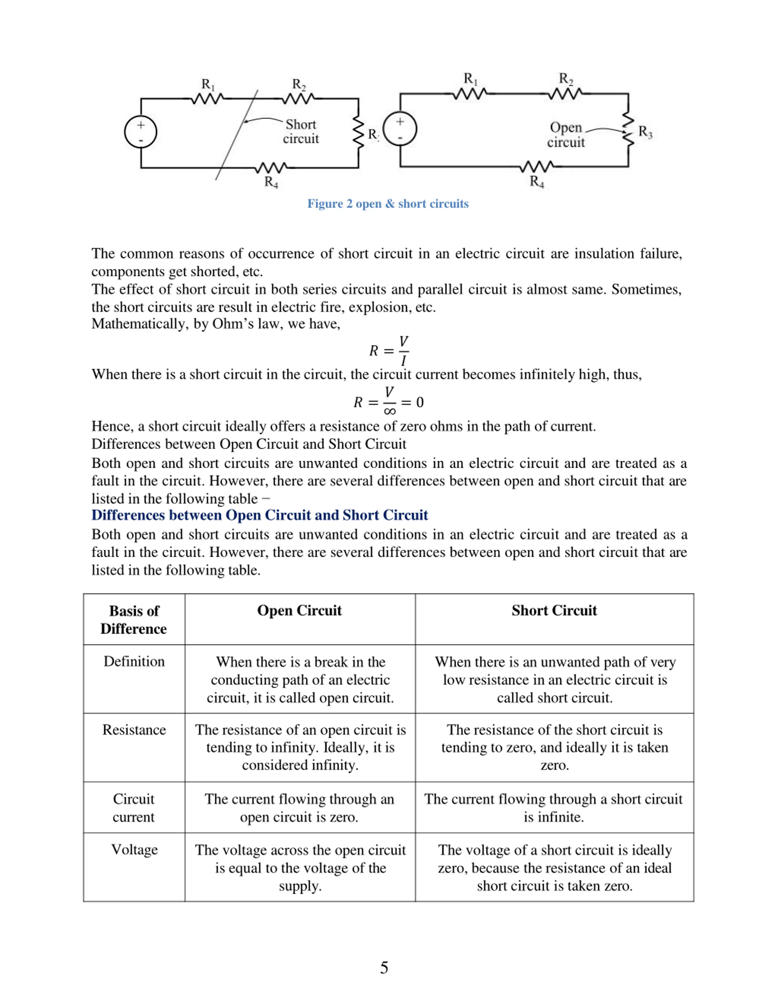 Figure 2 open & short circuits The common reasons of occurrence of short circuit in an electric circuit are insulation failure, components get shorted, etc. The effect of short circuit in both series circuits and parallel circuit is almost same. Sometimes, the short circuits are result in electric fire, explosion, etc. Mathematically, by Ohm s law, we have, ? ? ? = When there is a short circuit in the circuit, the circuit current becomes infinitely high, thus, ? ? = = 0 Hence, a short circuit ideally offers a resistance of zero ohms in the path of current. Differences between Open Circuit and Short Circuit Both open and short circuits are unwanted conditions in an electric circuit and are treated as a fault in the circuit. However, there are several differences between open and short circuit that are listed in the following table Differences between Open Circuit and Short Circuit Both open and short circuits are unwanted conditions in an electric circuit and are treated as a fault in the circuit. However, there are several differences between open and short circuit that are listed in the following table. Open Circuit Short Circuit Basis of Difference Definition When there is a break in the conducting path of an electric circuit, it is called open circuit. When there is an unwanted path of very low resistance in an electric circuit is called short circuit. The resistance of an open circuit is tending to infinity. Ideally, it is considered infinity. The resistance of the short circuit is tending to zero, and ideally it is taken zero. Resistance Circuit current The current flowing through an open circuit is zero. The current flowing through a short circuit is infinite. Voltage The voltage across the open circuit is equal to the voltage of the supply. The voltage of a short circuit is ideally zero, because the resistance of an ideal short circuit is taken zero. 5