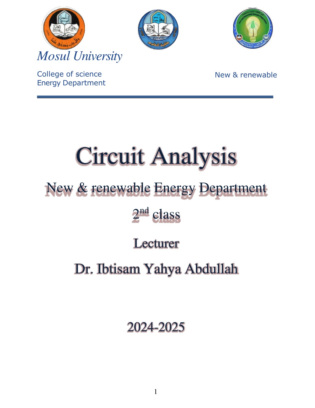 Mosul University College of science Energy Department New & renewable Circuit Analysis New & renewable Energy Department 2nd class Lecturer Dr. Ibtisam Yahya Abdullah 2024-2025 1