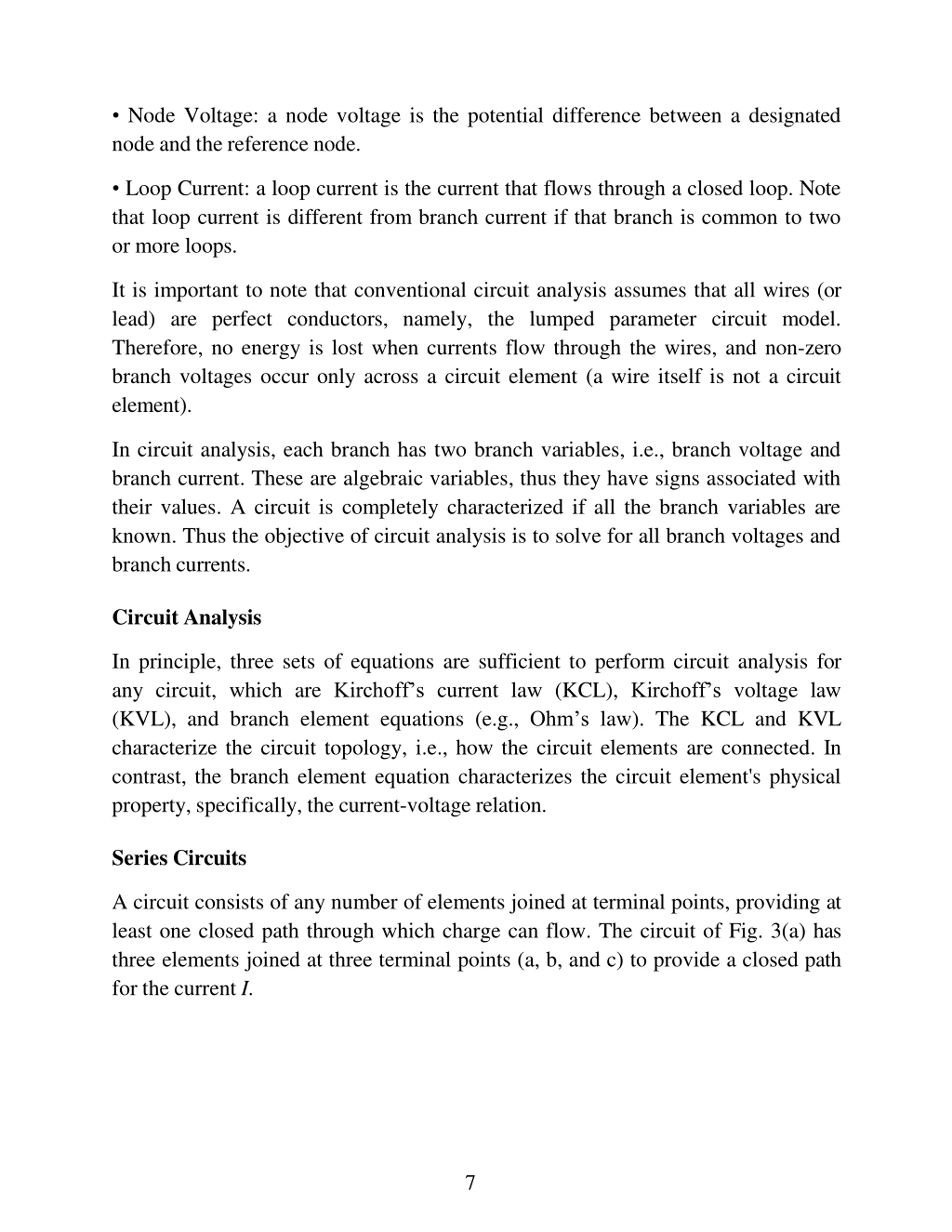 Node Voltage: a node voltage is the potential difference between a designated node and the reference node. Loop Current: a loop current is the current that flows through a closed loop. Note that loop current is different from branch current if that branch is common to two or more loops. It is important to note that conventional circuit analysis assumes that all wires (or lead) are perfect conductors, namely, the lumped parameter circuit model. Therefore, no energy is lost when currents flow through the wires, and non-zero branch voltages occur only across a circuit element (a wire itself is not a circuit element). In circuit analysis, each branch has two branch variables, i.e., branch voltage and branch current. These are algebraic variables, thus they have signs associated with their values. A circuit is completely characterized if all the branch variables are known. Thus the objective of circuit analysis is to solve for all branch voltages and branch currents. Circuit Analysis In principle, three sets of equations are sufficient to perform circuit analysis for any circuit, which are Kirchoff s current law (KCL), Kirchoff s voltage law (KVL), and branch element equations (e.g., Ohm s law). The KCL and KVL characterize the circuit topology, i.e., how the circuit elements are connected. In contrast, the branch element equation characterizes the circuit element's physical property, specifically, the current-voltage relation. Series Circuits A circuit consists of any number of elements joined at terminal points, providing at least one closed path through which charge can flow. The circuit of Fig. 3(a) has three elements joined at three terminal points (a, b, and c) to provide a closed path for the current I. 7