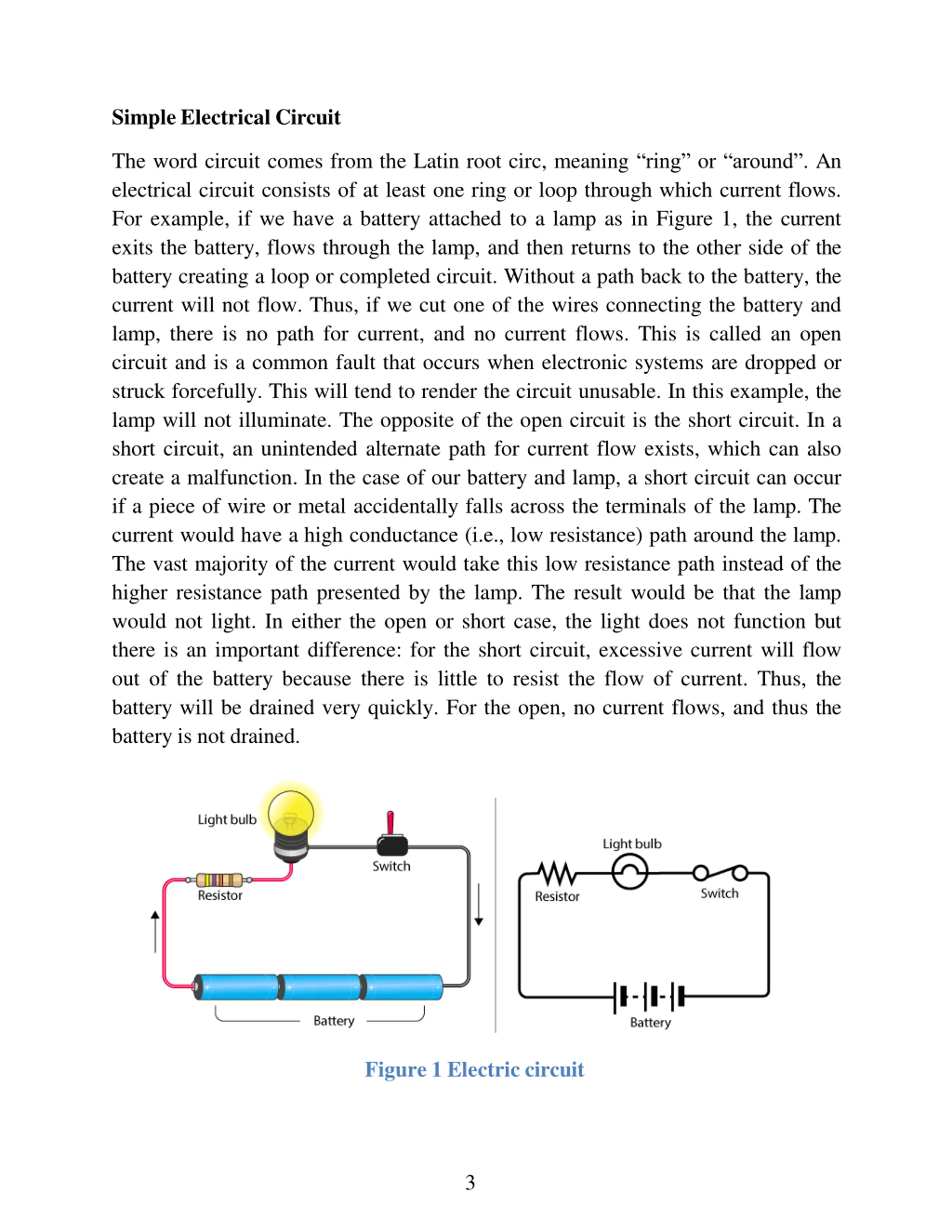 Simple Electrical Circuit The word circuit comes from the Latin root circ, meaning ring or around . An electrical circuit consists of at least one ring or loop through which current flows. For example, if we have a battery attached to a lamp as in Figure 1, the current exits the battery, flows through the lamp, and then returns to the other side of the battery creating a loop or completed circuit. Without a path back to the battery, the current will not flow. Thus, if we cut one of the wires connecting the battery and lamp, there is no path for current, and no current flows. This is called an open circuit and is a common fault that occurs when electronic systems are dropped or struck forcefully. This will tend to render the circuit unusable. In this example, the lamp will not illuminate. The opposite of the open circuit is the short circuit. In a short circuit, an unintended alternate path for current flow exists, which can also create a malfunction. In the case of our battery and lamp, a short circuit can occur if a piece of wire or metal accidentally falls across the terminals of the lamp. The current would have a high conductance (i.e., low resistance) path around the lamp. The vast majority of the current would take this low resistance path instead of the higher resistance path presented by the lamp. The result would be that the lamp would not light. In either the open or short case, the light does not function but there is an important difference: for the short circuit, excessive current will flow out of the battery because there is little to resist the flow of current. Thus, the battery will be drained very quickly. For the open, no current flows, and thus the battery is not drained. Figure 1 Electric circuit 3