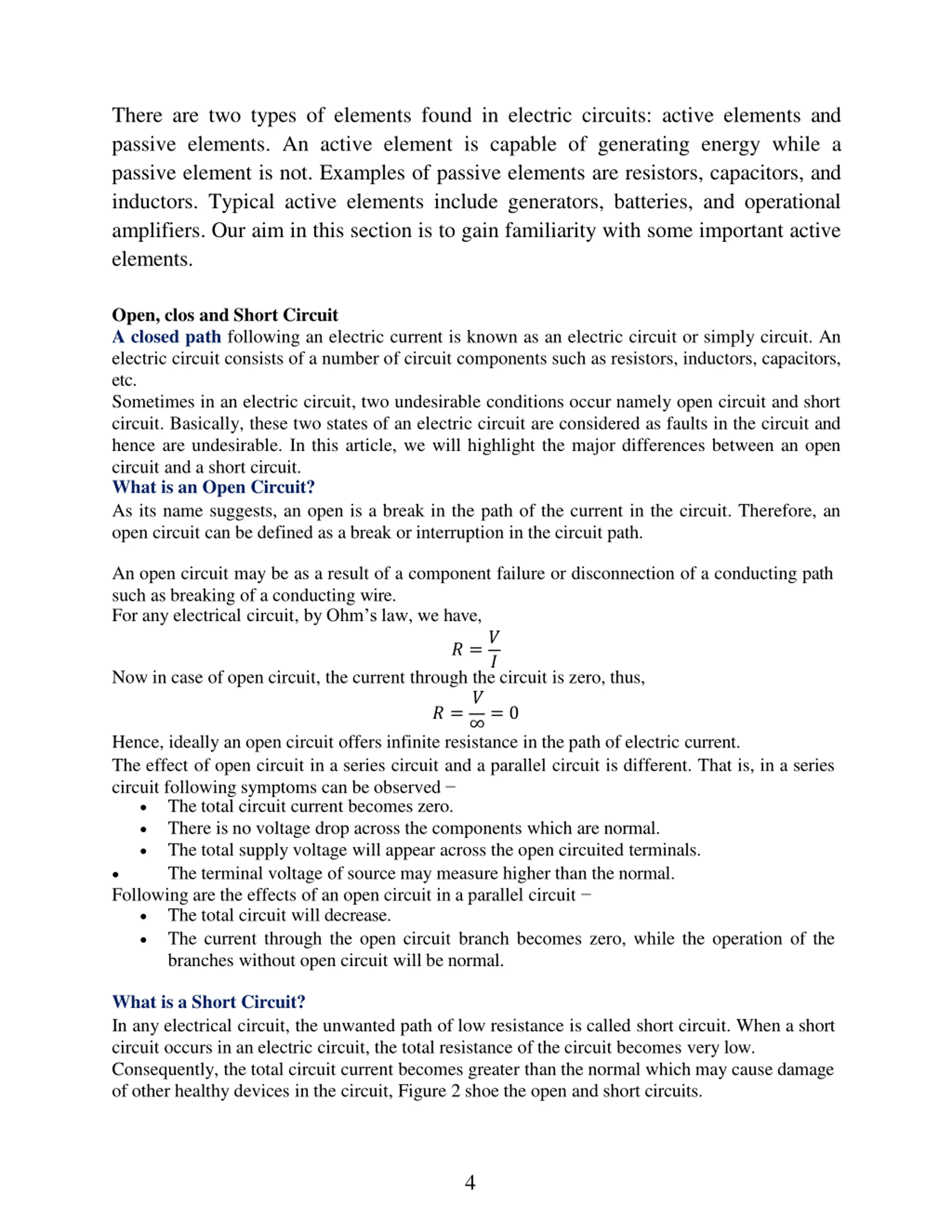 There are two types of elements found in electric circuits: active elements and passive elements. An active element is capable of generating energy while a passive element is not. Examples of passive elements are resistors, capacitors, and inductors. Typical active elements include generators, batteries, and operational amplifiers. Our aim in this section is to gain familiarity with some important active elements. Open, clos and Short Circuit A closed path following an electric current is known as an electric circuit or simply circuit. An electric circuit consists of a number of circuit components such as resistors, inductors, capacitors, etc. Sometimes in an electric circuit, two undesirable conditions occur namely open circuit and short circuit. Basically, these two states of an electric circuit are considered as faults in the circuit and hence are undesirable. In this article, we will highlight the major differences between an open circuit and a short circuit. What is an Open Circuit? As its name suggests, an open is a break in the path of the current in the circuit. Therefore, an open circuit can be defined as a break or interruption in the circuit path. An open circuit may be as a result of a component failure or disconnection of a conducting path such as breaking of a conducting wire. For any electrical circuit, by Ohm s law, we have, ? ? ? = Now in case of open circuit, the current through the circuit is zero, thus, ? ? = = 0 Hence, ideally an open circuit offers infinite resistance in the path of electric current. The effect of open circuit in a series circuit and a parallel circuit is different. That is, in a series circuit following symptoms can be observed The total circuit current becomes zero. There is no voltage drop across the components which are normal. The total supply voltage will appear across the open circuited terminals. The terminal voltage of source may measure higher than the normal. Following are the effects of an open circuit in a parallel circuit The total circuit will decrease. The current through the open circuit branch becomes zero, while the operation of the branches without open circuit will be normal. What is a Short Circuit? In any electrical circuit, the unwanted path of low resistance is called short circuit. When a short circuit occurs in an electric circuit, the total resistance of the circuit becomes very low. Consequently, the total circuit current becomes greater than the normal which may cause damage of other healthy devices in the circuit, Figure 2 shoe the open and short circuits. 4