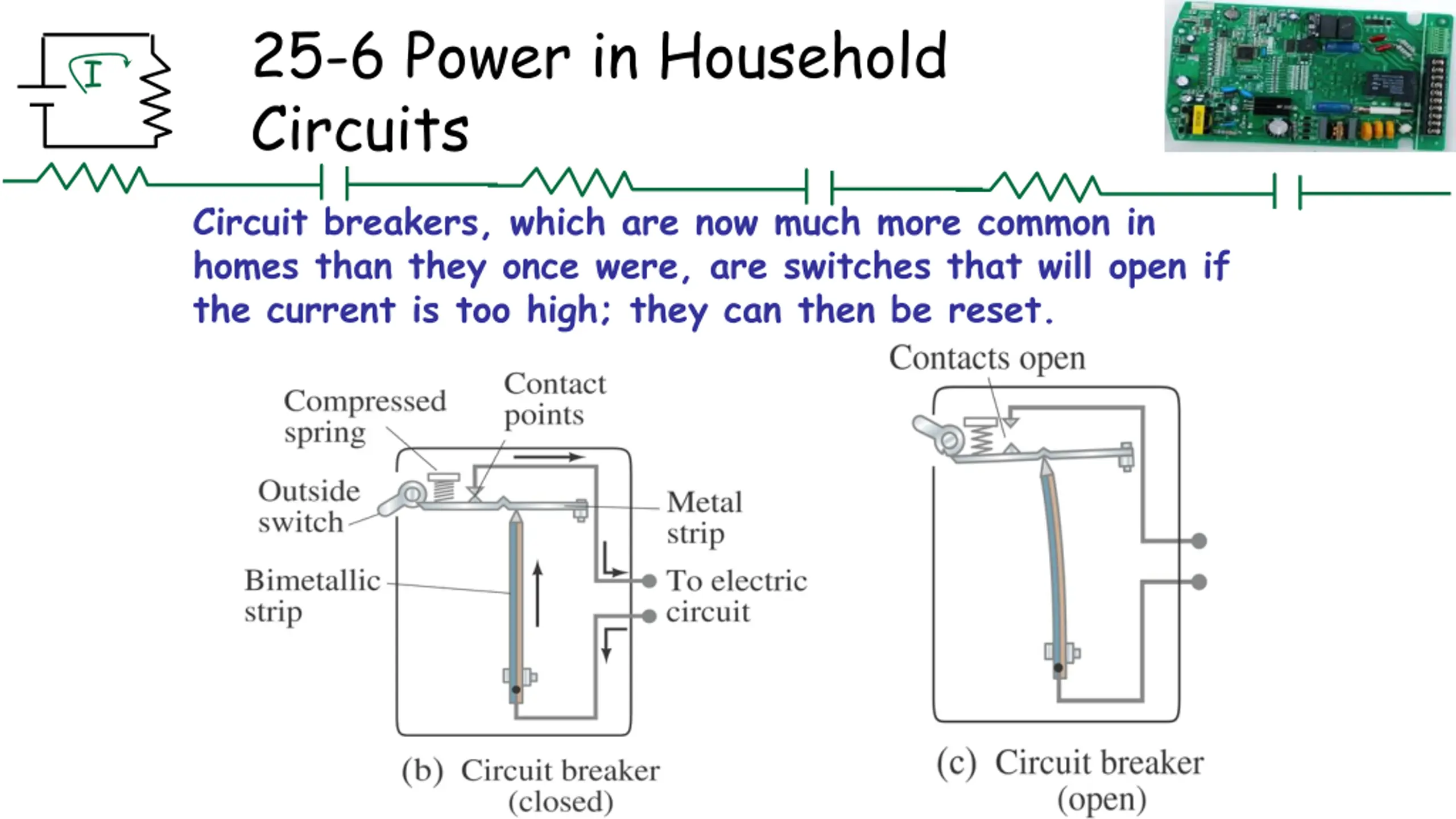 25-6 Power in Household Circuits I Circuit breakers, which are now much more common in homes than they once were, are switches that will open if the current is too high; they can then be reset.