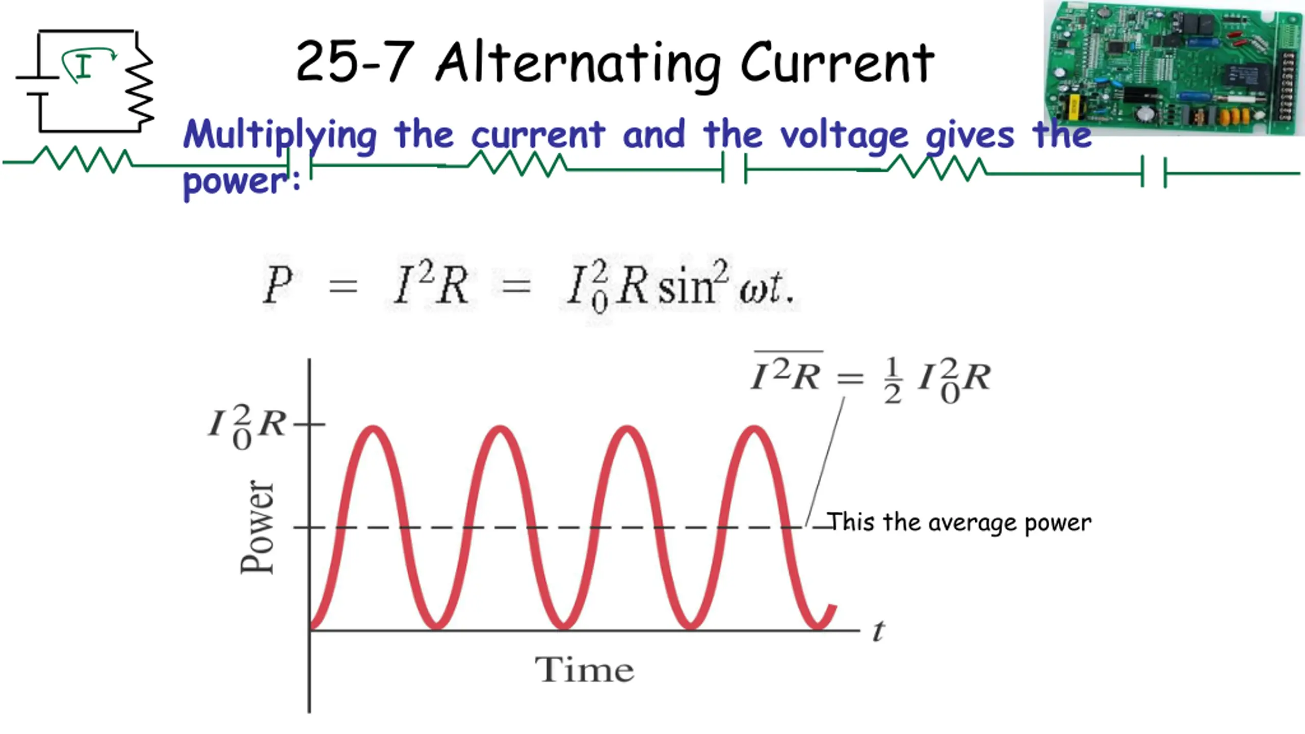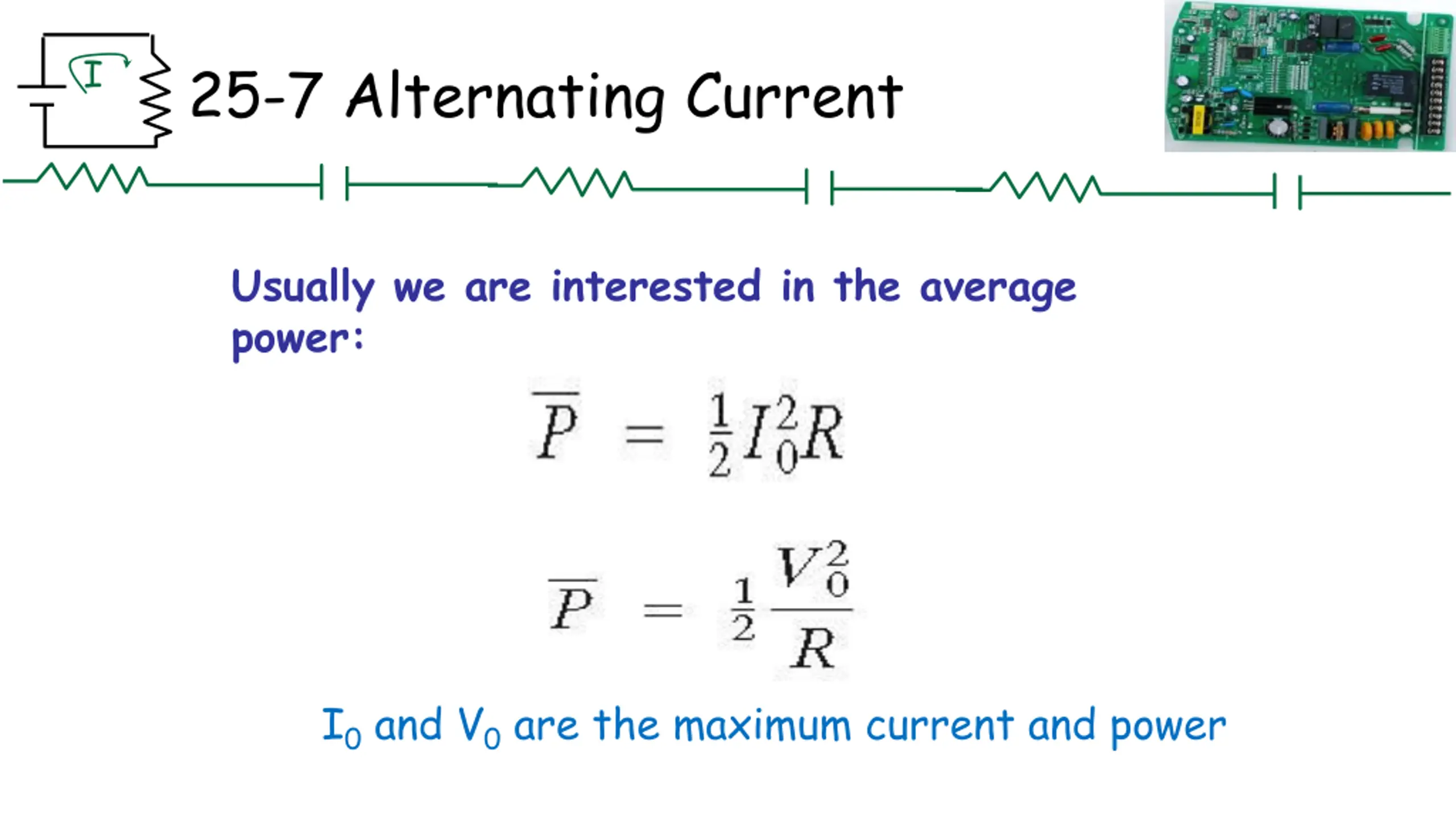 I 25-7 Alternating Current Usually we are interested in the average power: I0 and V0 are the maximum current and power
