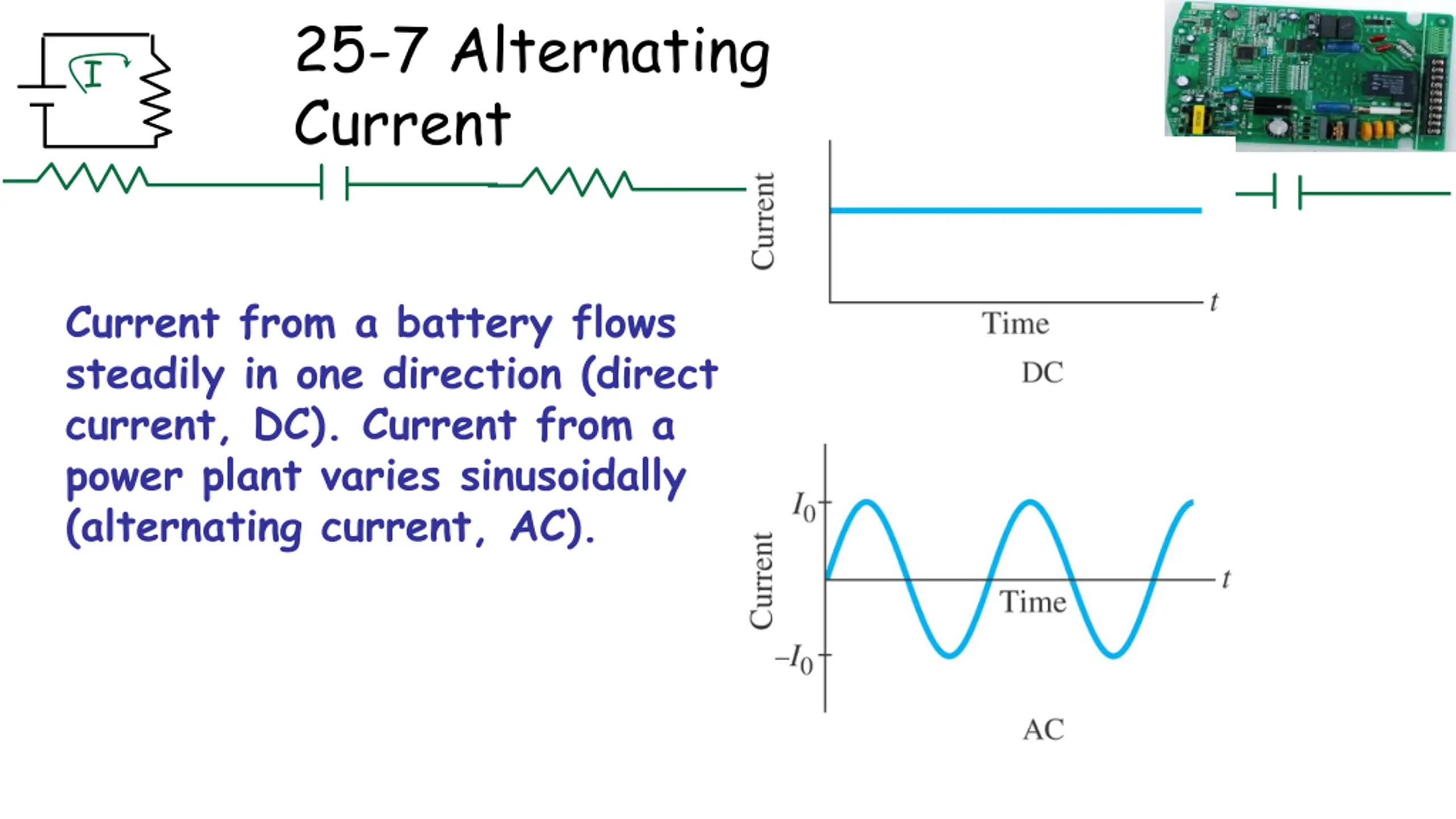 25-7 Alternating Current I Current from a battery flows steadily in one direction (direct current, DC). Current from a power plant varies sinusoidally (alternating current, AC).