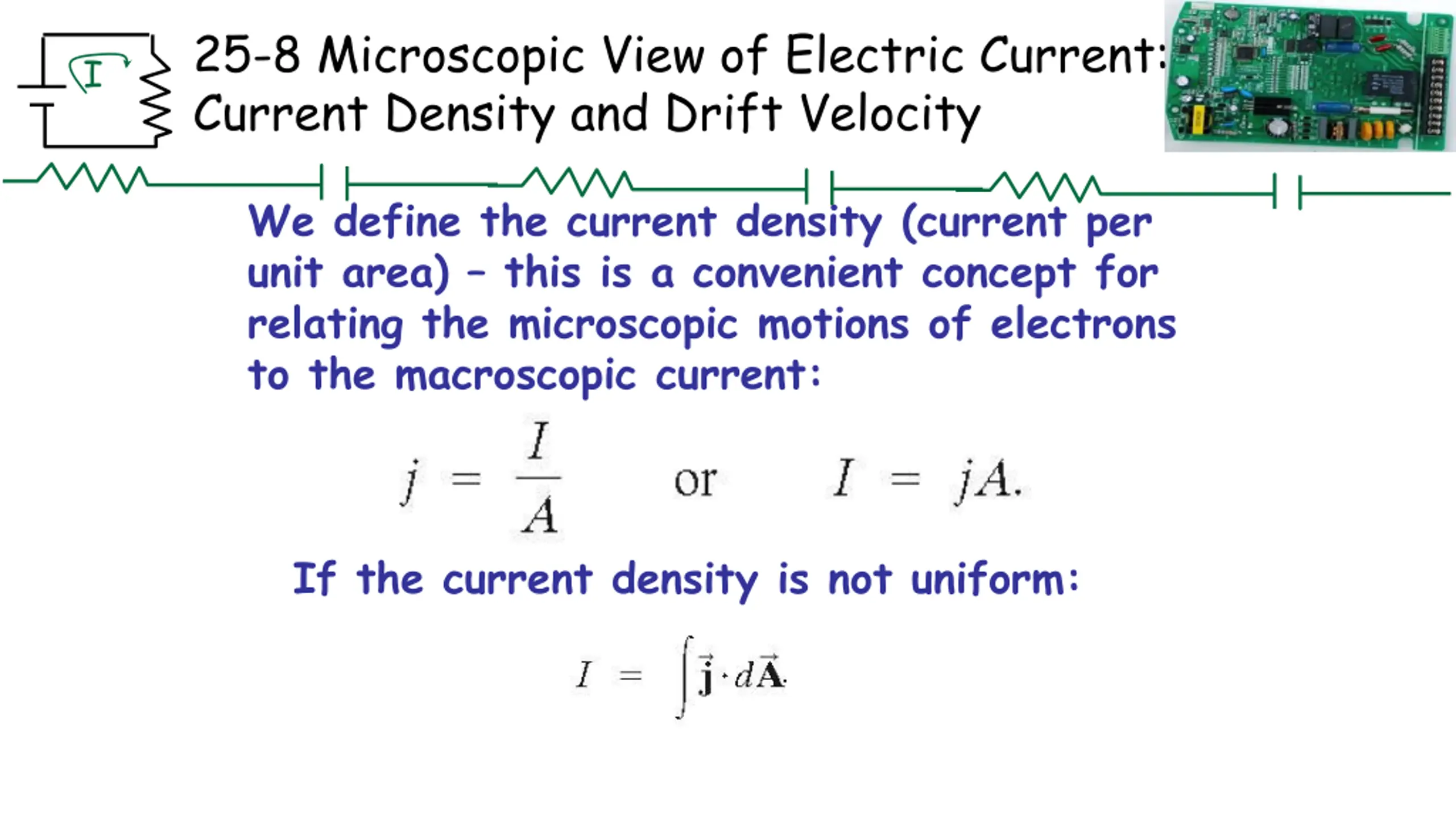 25-8 Microscopic View of Electric Current: Current Density and Drift Velocity I We define the current density (current per unit area) this is a convenient concept for relating the microscopic motions of electrons to the macroscopic current: If the current density is not uniform: .