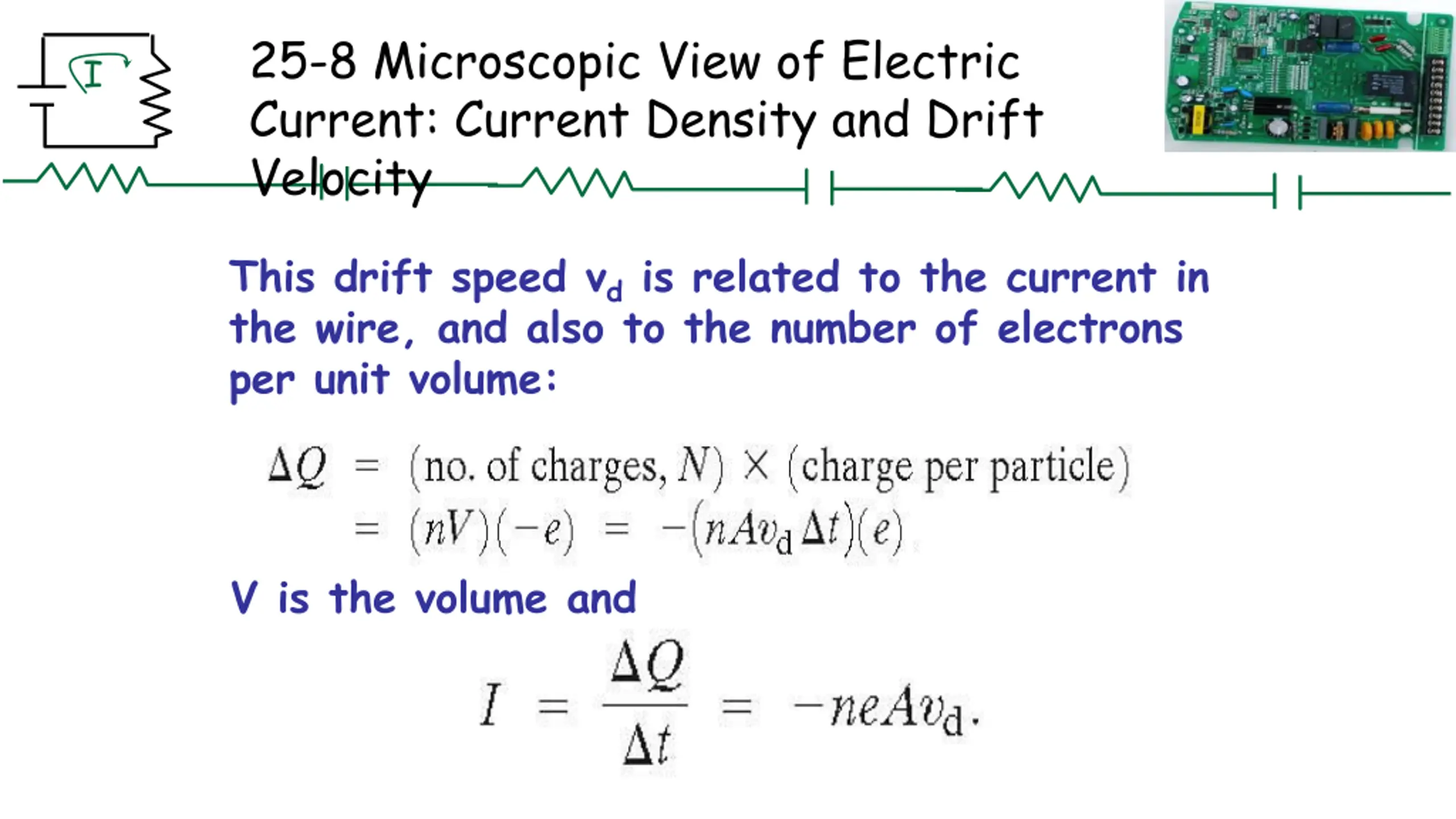 25-8 Microscopic View of Electric Current: Current Density and Drift Velocity I This drift speed vd is related to the current in the wire, and also to the number of electrons per unit volume: V is the volume and
