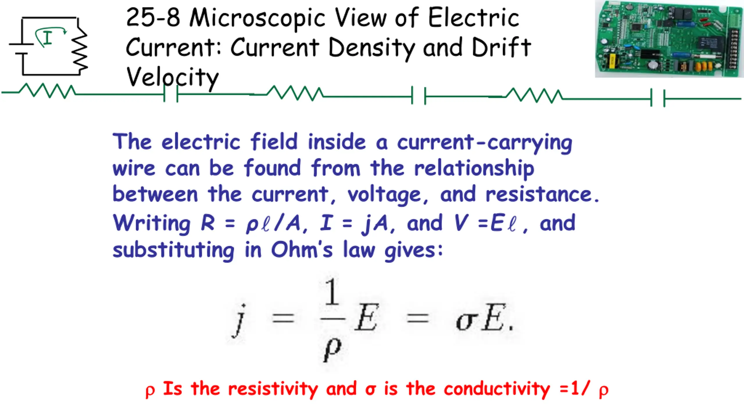 25-8 Microscopic View of Electric Current: Current Density and Drift Velocity I The electric field inside a current-carrying wire can be found from the relationship between the current, voltage, and resistance. Writing R = l/A, I = jA, and V =El , and substituting in Ohm s law gives: Is the resistivity and is the conductivity =1/