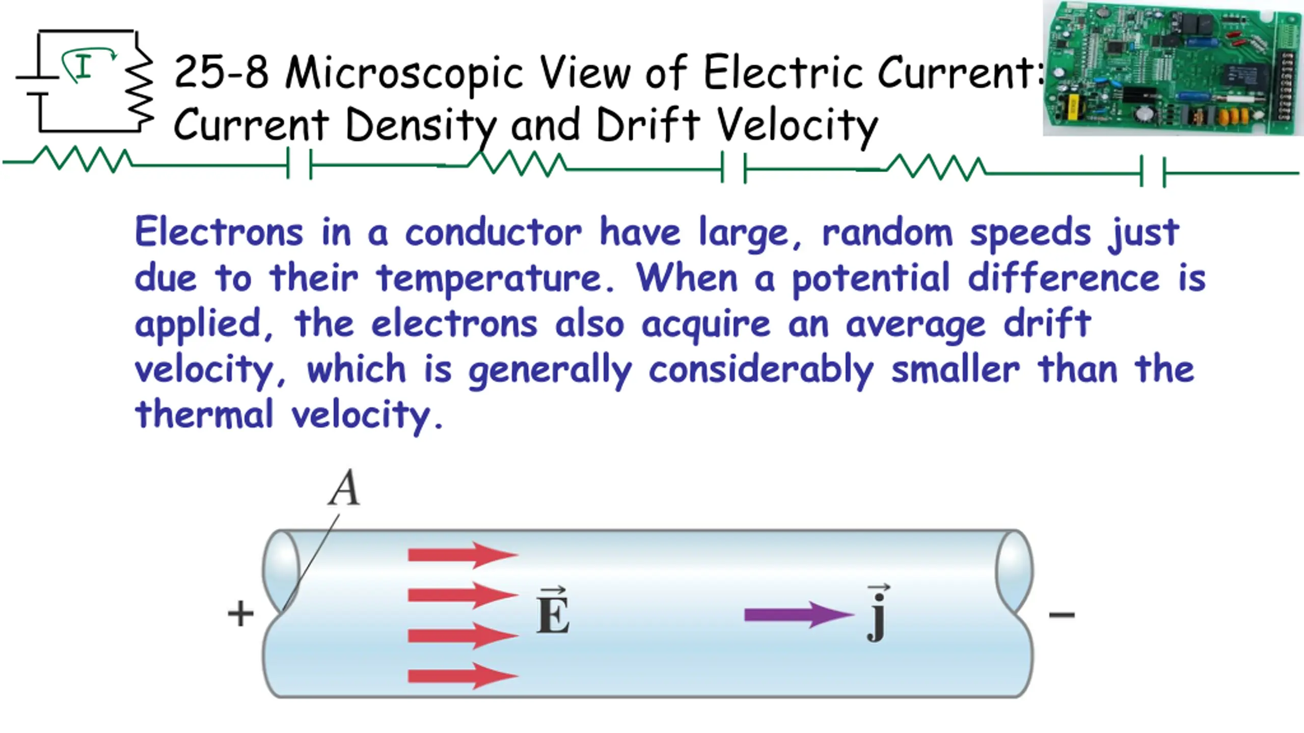 25-8 Microscopic View of Electric Current: Current Density and Drift Velocity I Electrons in a conductor have large, random speeds just due to their temperature. When a potential difference is applied, the electrons also acquire an average drift velocity, which is generally considerably smaller than the thermal velocity.