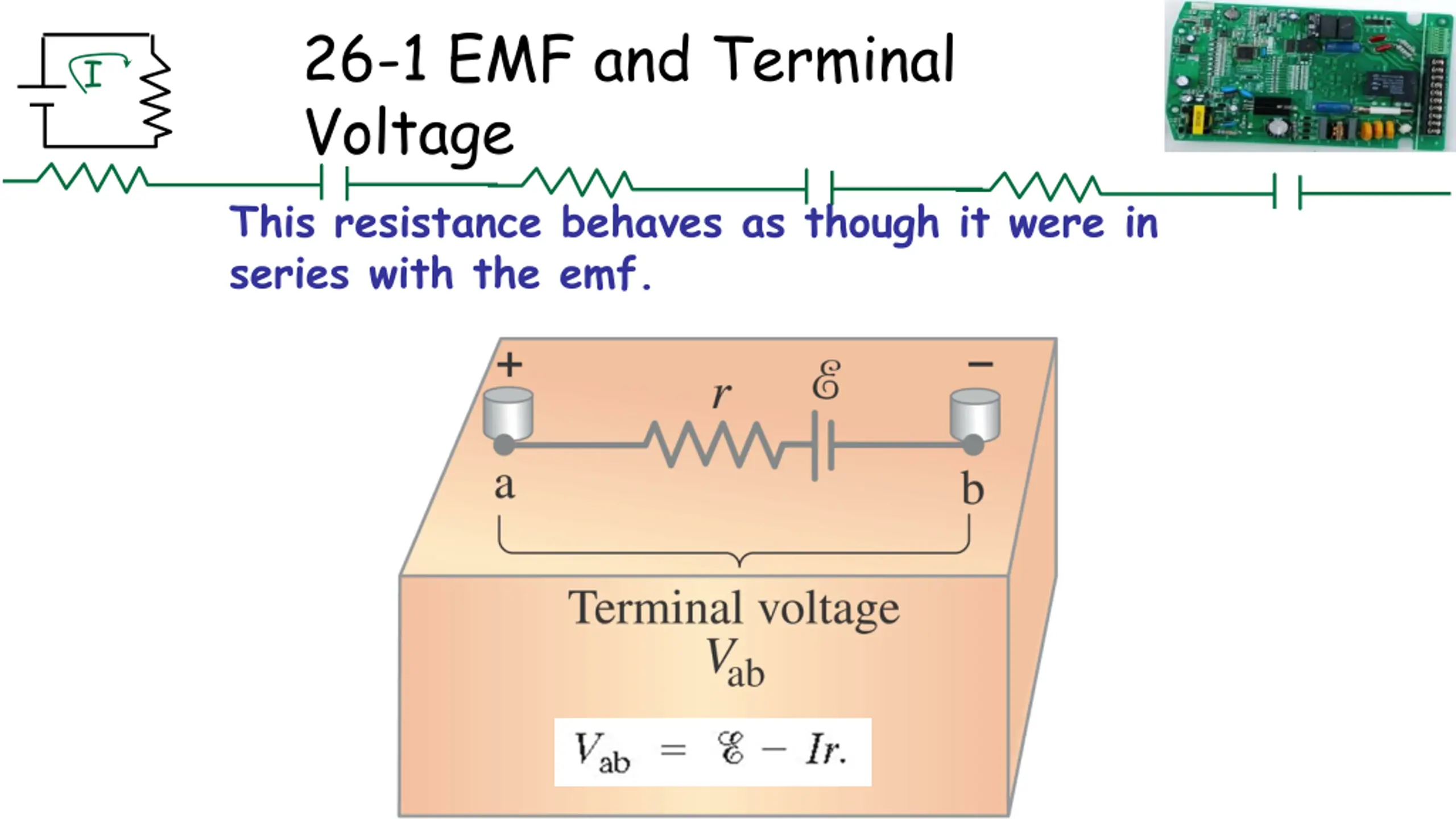 26-1 EMF and Terminal Voltage I This resistance behaves as though it were in series with the emf.
