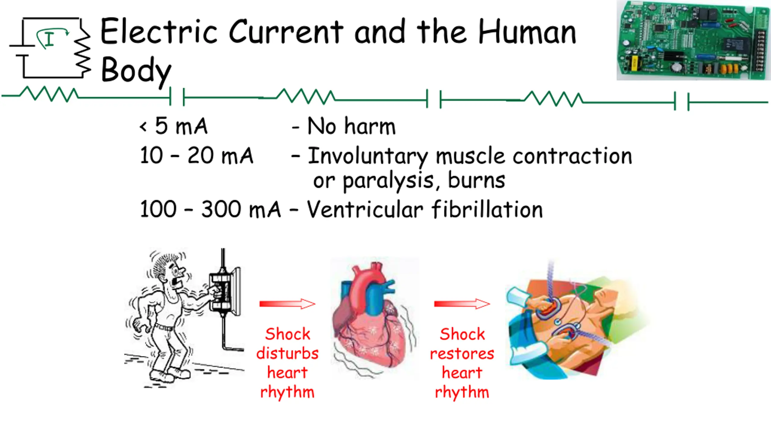 Electric Current and the Human Body I < 5 mA 10 20 mA - No harm Involuntary muscle contraction or paralysis, burns 100 300 mA Ventricular fibrillation Shock disturbs heart rhythm Shock restores heart rhythm