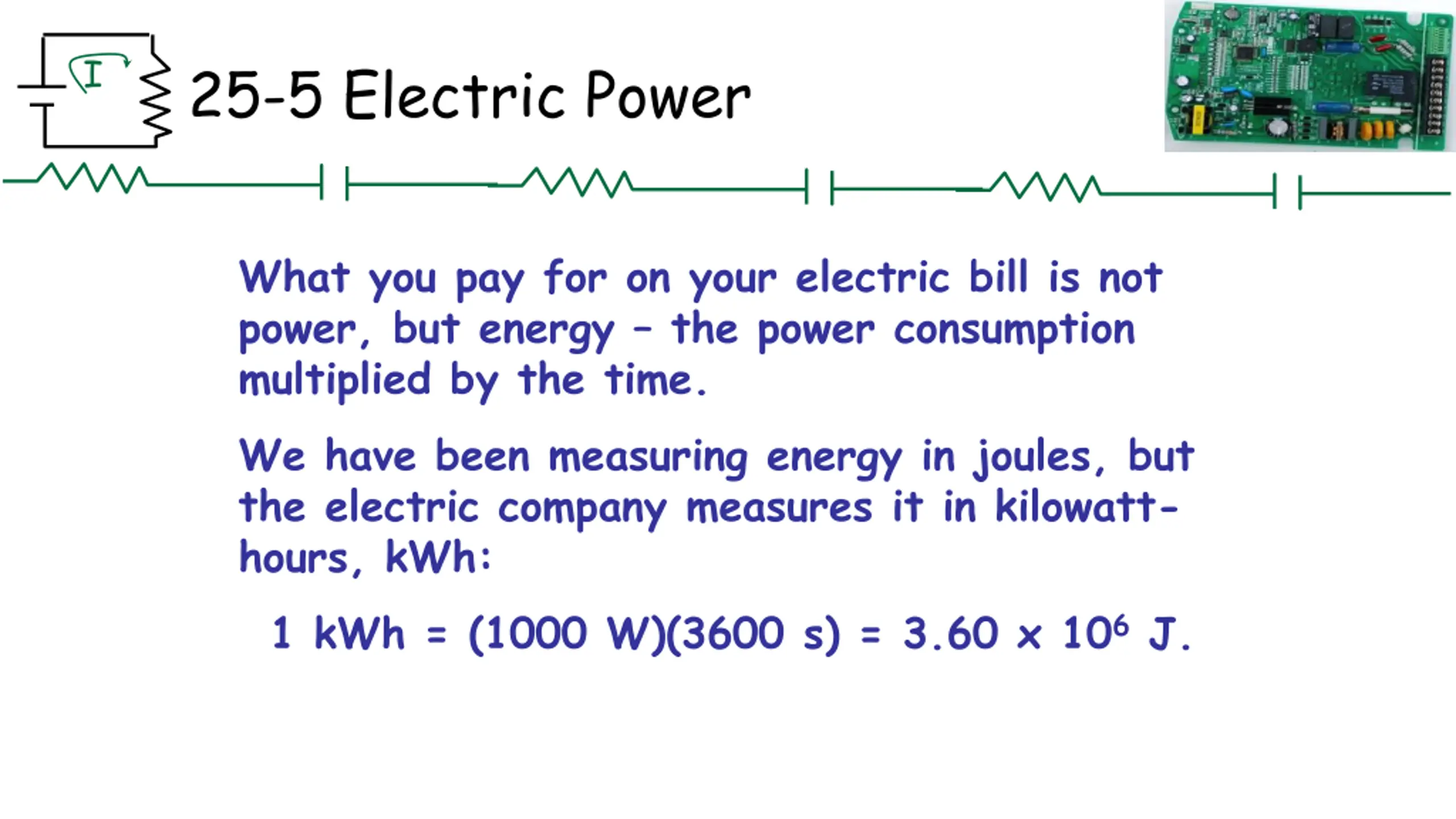 I 25-5 Electric Power What you pay for on your electric bill is not power, but energy the power consumption multiplied by the time. We have been measuring energy in joules, but the electric company measures it in kilowatt- hours, kWh: 1 kWh = (1000 W)(3600 s) = 3.60 x 106 J.
