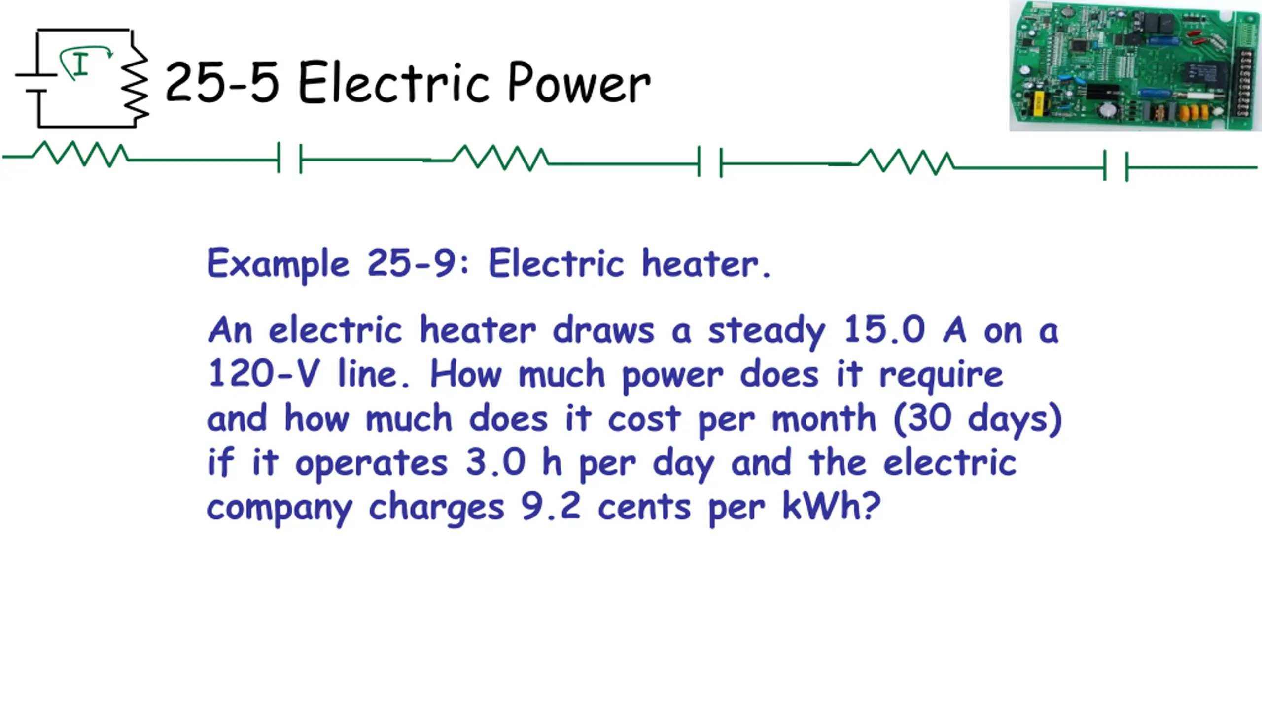 I 25-5 Electric Power Example 25-9: Electric heater. An electric heater draws a steady 15.0 A on a 120-V line. How much power does it require and how much does it cost per month (30 days) if it operates 3.0 h per day and the electric company charges 9.2 cents per kWh?