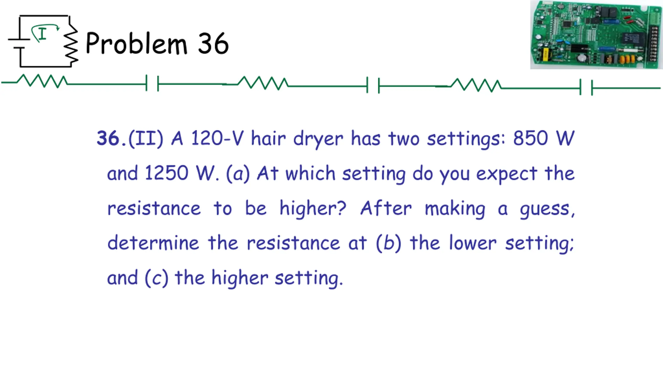 I Problem 36 36.(II) A 120-V hair dryer has two settings: 850 W and 1250 W. (a) At which setting do you expect the resistance to be higher? After making a guess, determine the resistance at (b) the lower setting; and (c) the higher setting.