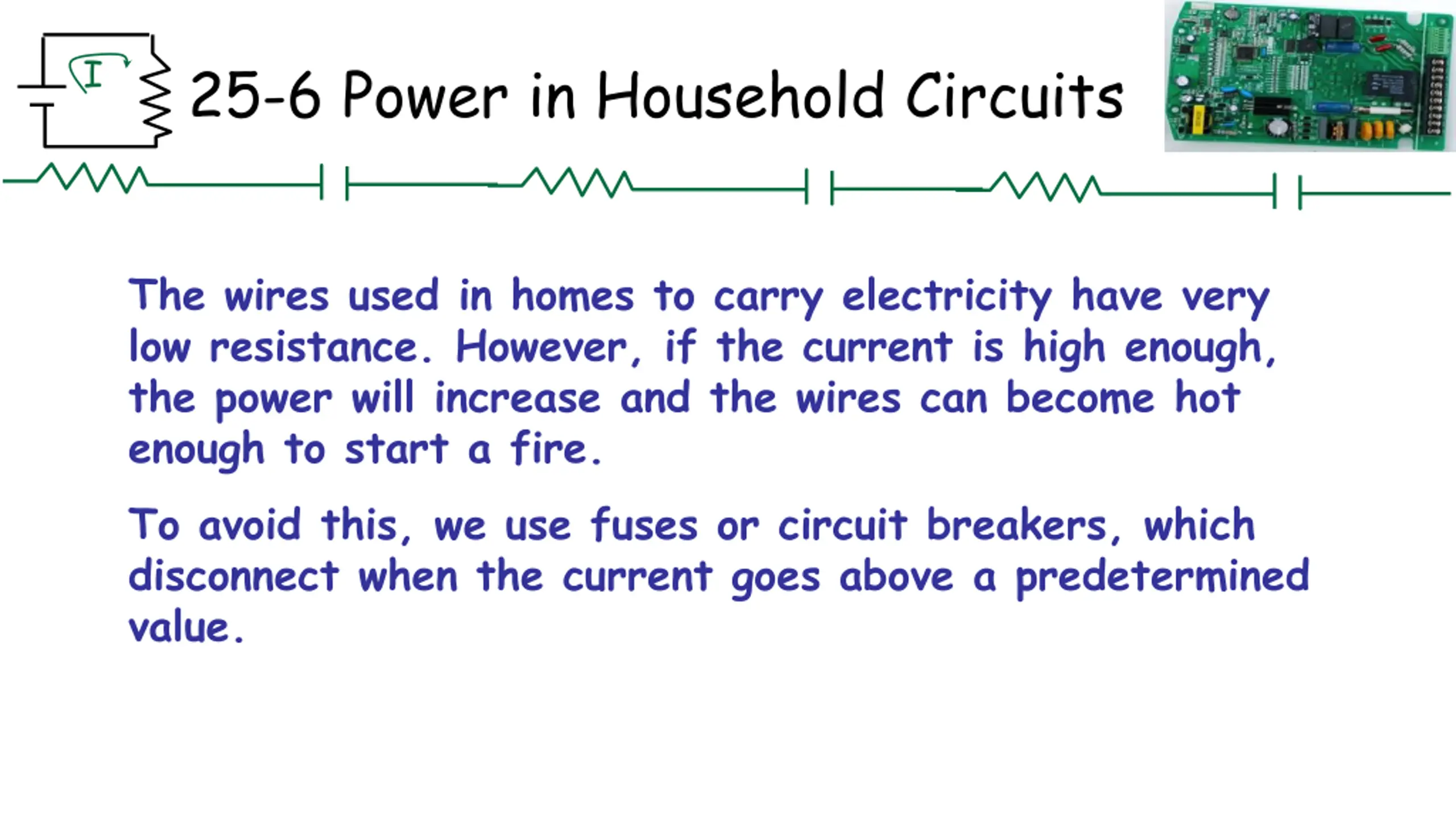 I 25-6 Power in Household Circuits The wires used in homes to carry electricity have very low resistance. However, if the current is high enough, the power will increase and the wires can become hot enough to start a fire. To avoid this, we use fuses or circuit breakers, which disconnect when the current goes above a predetermined value.
