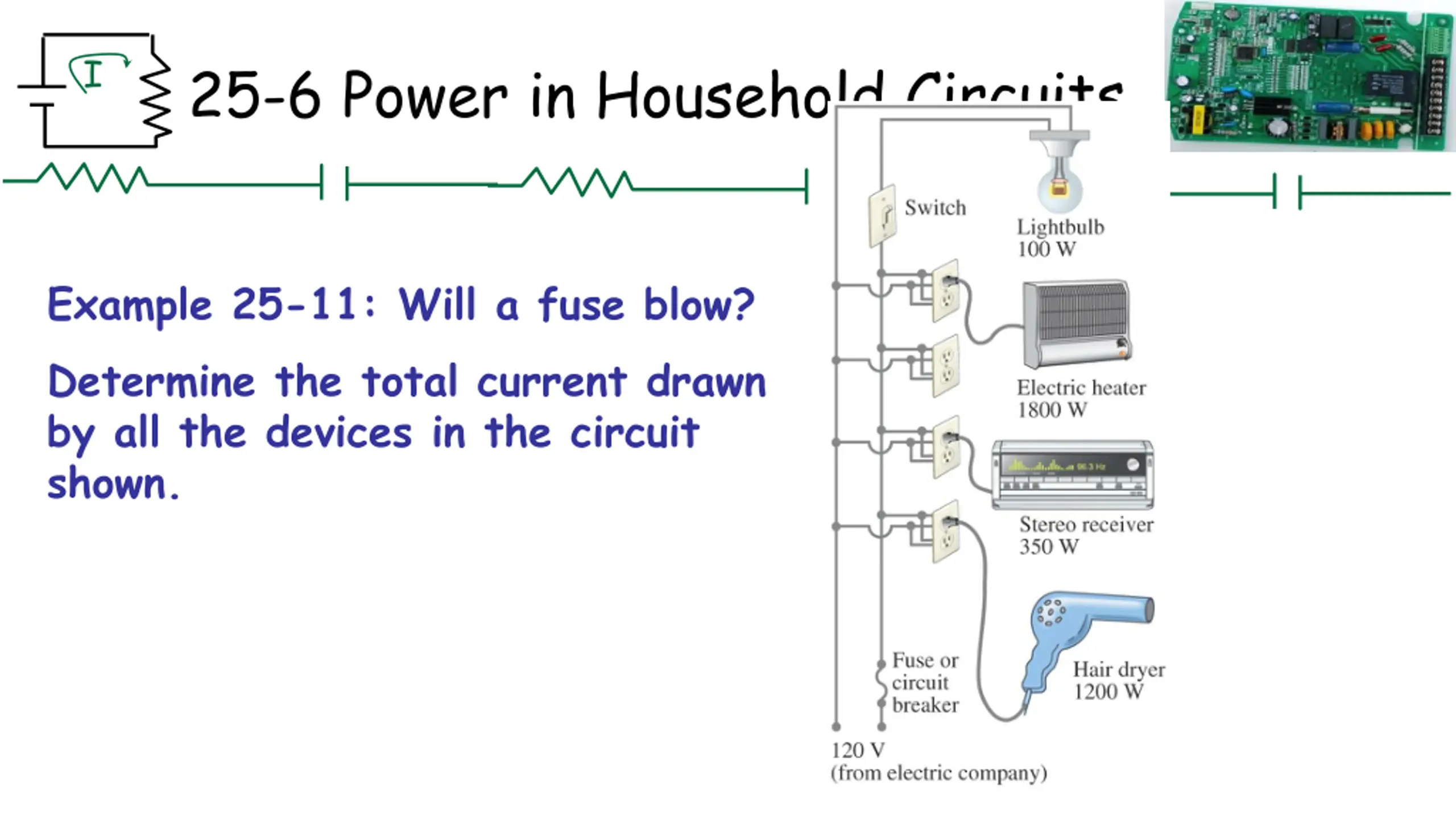 I 25-6 Power in Household Circuits Example 25-11: Will a fuse blow? Determine the total current drawn by all the devices in the circuit shown.