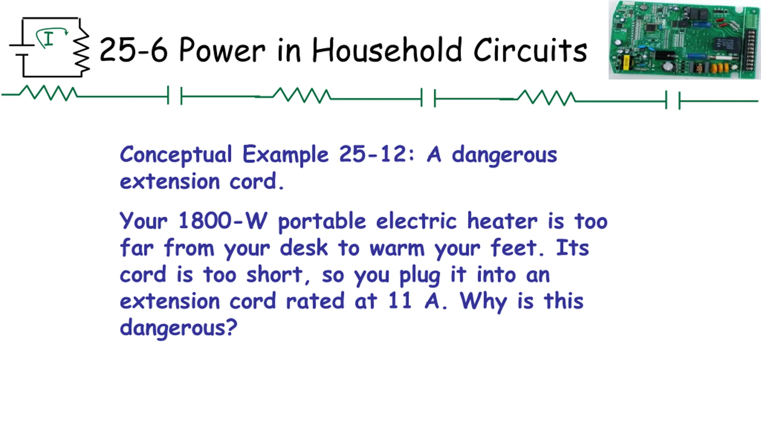 I 25-6 Power in Household Circuits Conceptual Example 25-12: A dangerous extension cord. Your 1800-W portable electric heater is too far from your desk to warm your feet. Its cord is too short, so you plug it into an extension cord rated at 11 A. Why is this dangerous?