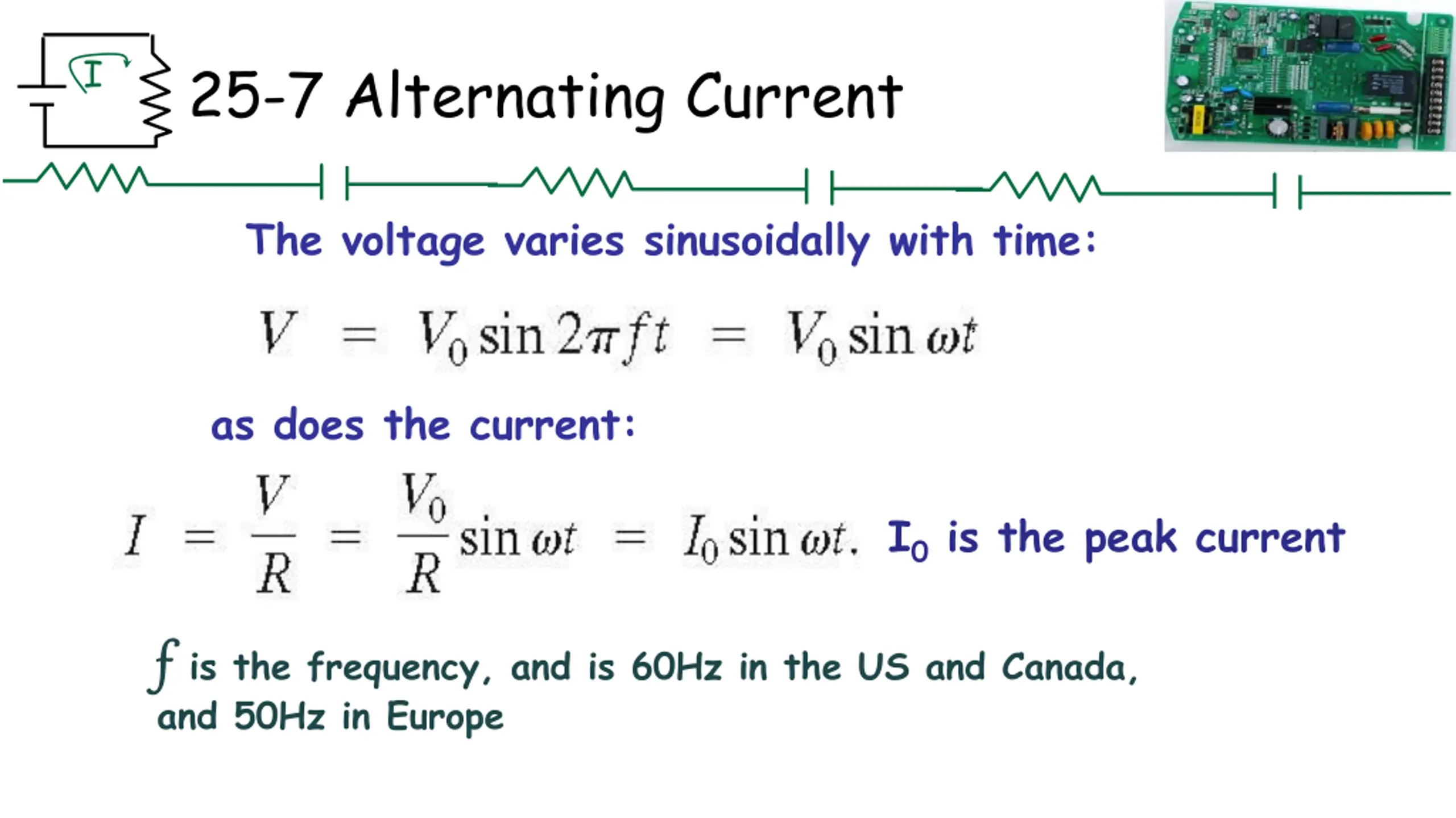 I 25-7 Alternating Current The voltage varies sinusoidally with time: , as does the current: I0 is the peak current f fis the frequency, and is 60Hz in the US and Canada, and 50Hz in Europe