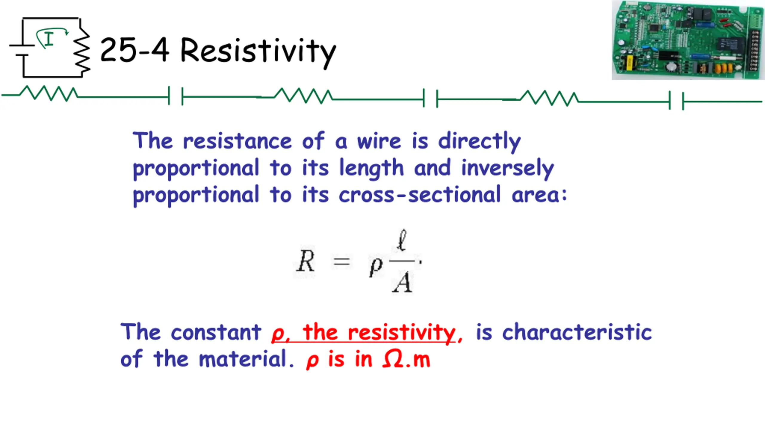 I 25-4 Resistivity The resistance of a wire is directly proportional to its length and inversely proportional to its cross-sectional area: The constant , the resistivity, is characteristic of the material. is in .m