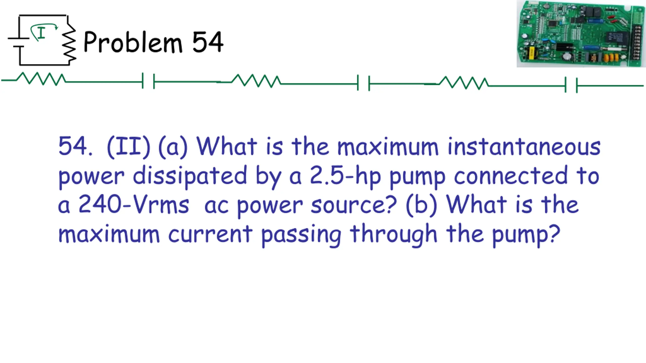 I Problem 54 54. (II) (a) What is the maximum instantaneous power dissipated by a 2.5-hp pump connected to a 240-Vrms ac power source? (b) What is the maximum current passing through the pump?