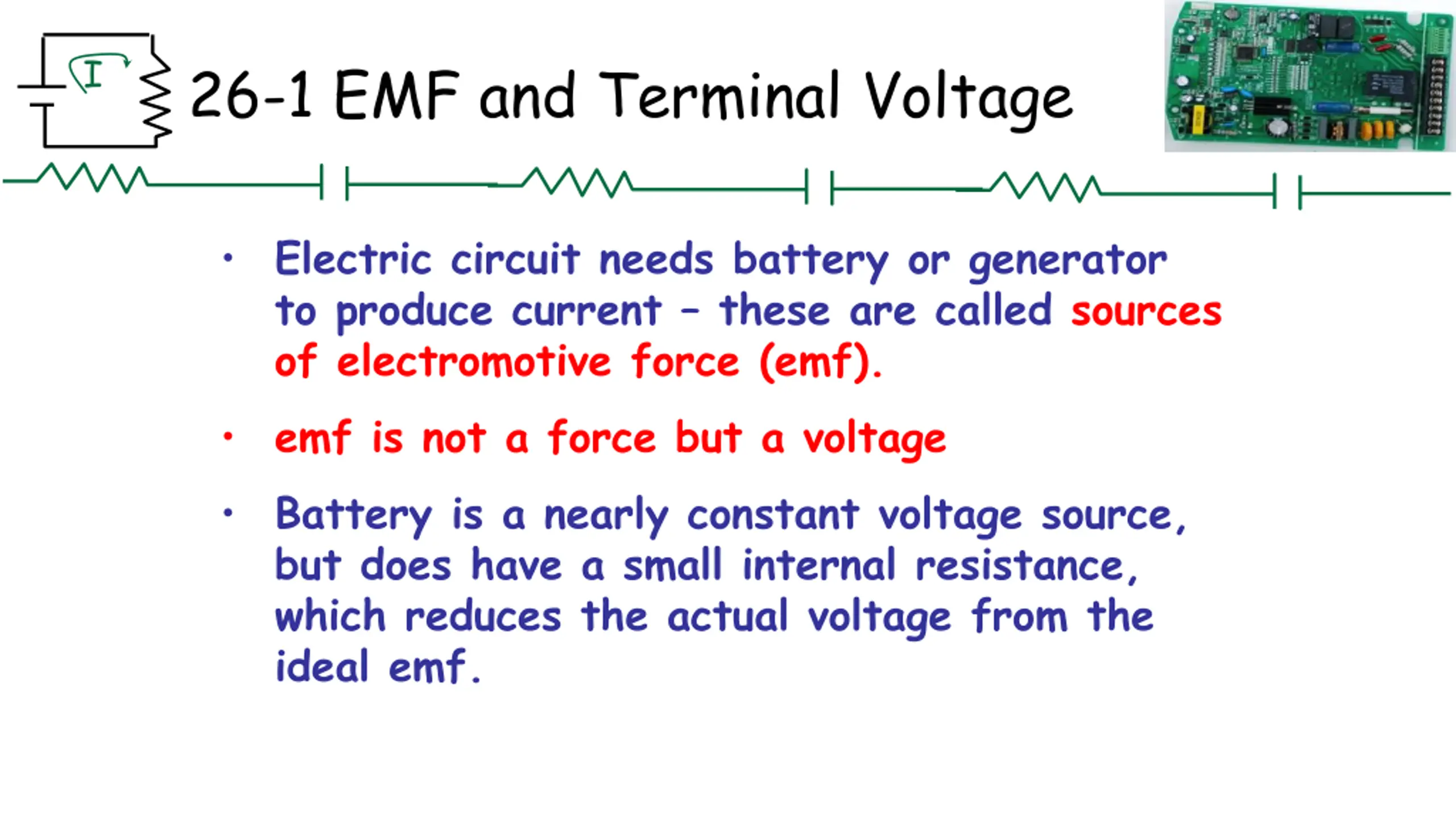 I 26-1 EMF and Terminal Voltage Electric circuit needs battery or generator to produce current these are called sources of electromotive force (emf). emf is not a force but a voltage Battery is a nearly constant voltage source, but does have a small internal resistance, which reduces the actual voltage from the ideal emf.