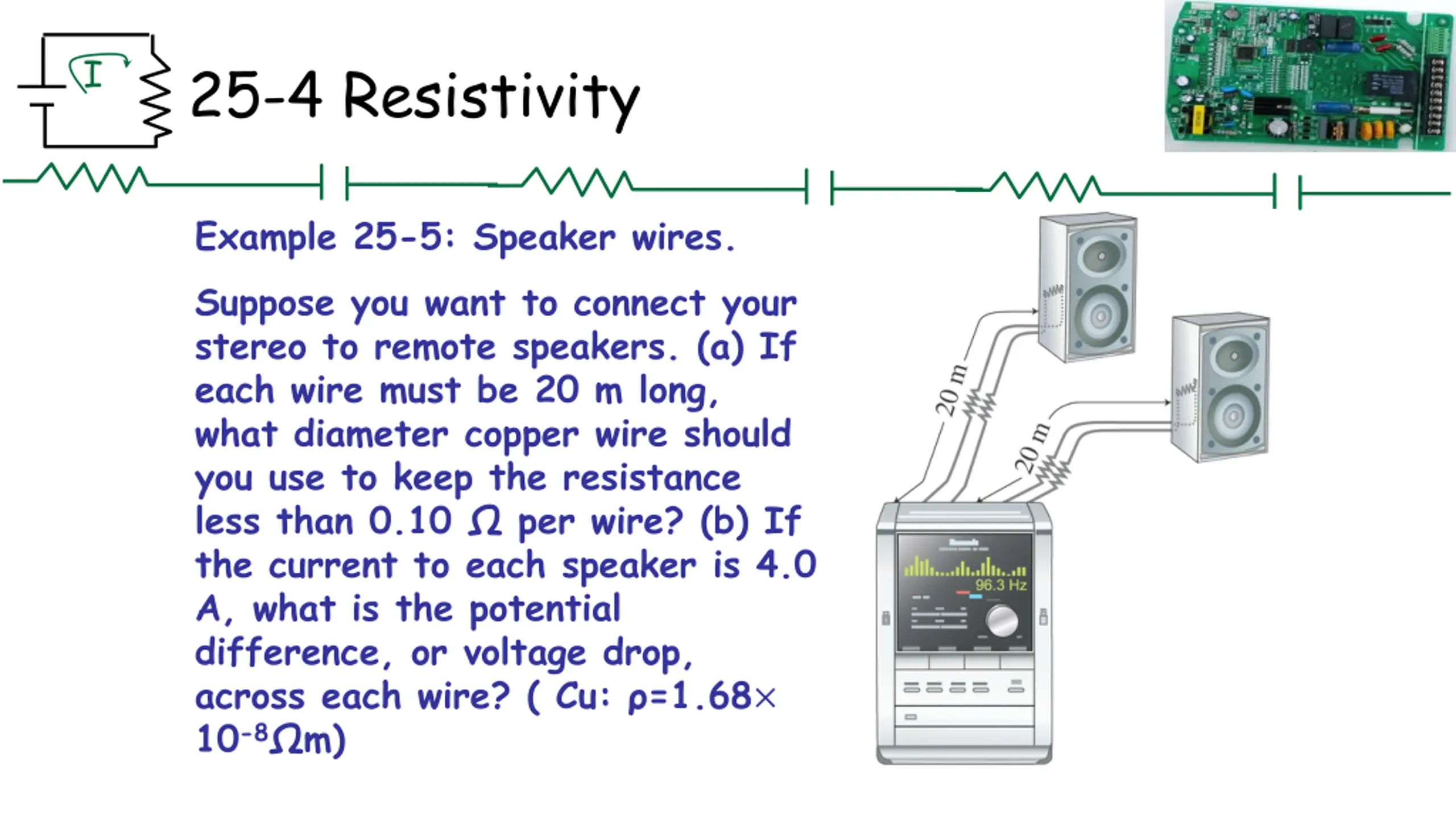 I 25-4 Resistivity Example 25-5: Speaker wires. Suppose you want to connect your stereo to remote speakers. (a) If each wire must be 20 m long, what diameter copper wire should you use to keep the resistance less than 0.10 per wire? (b) If the current to each speaker is 4.0 A, what is the potential difference, or voltage drop, across each wire? ( Cu: =1.68 10-8 m)