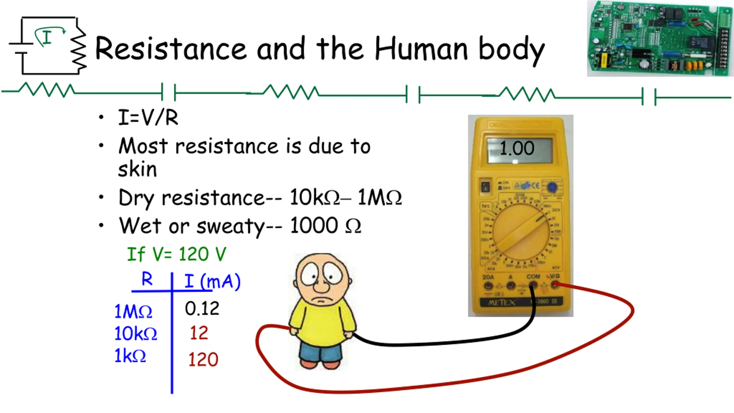 I Resistance and the Human body I=V/R Most resistance is due to skin Dry resistance-- 10k 1M Wet or sweaty-- 1000 If V= 120 V R I (mA) 1M 10k 1k 120 1.00 0.12 12