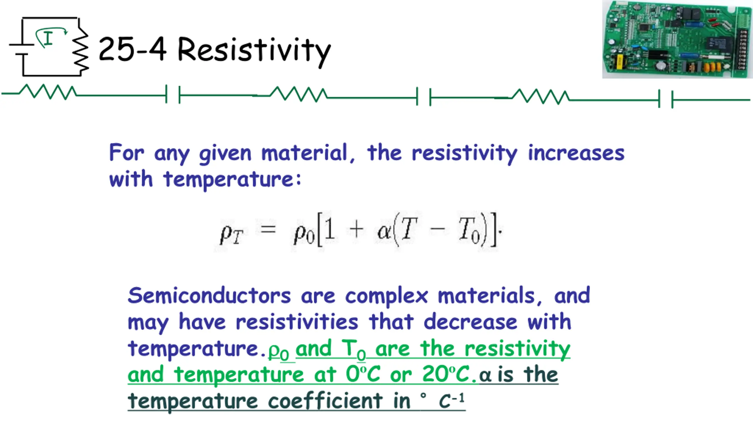 I 25-4 Resistivity For any given material, the resistivity increases with temperature: Semiconductors are complex materials, and may have resistivities that decrease with temperature. 0 and T0 are the resistivity and temperature at 0 C or 20 C. is the temperature coefficient in C-1