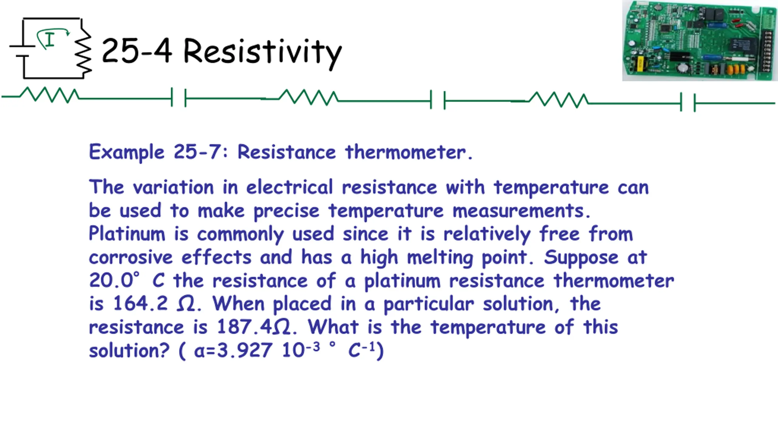 I 25-4 Resistivity Example 25-7: Resistance thermometer. The variation in electrical resistance with temperature can be used to make precise temperature measurements. Platinum is commonly used since it is relatively free from corrosive effects and has a high melting point. Suppose at 20.0 C the resistance of a platinum resistance thermometer is 164.2 . When placed in a particular solution, the resistance is 187.4 . What is the temperature of this solution? ( =3.927 10-3 C-1)