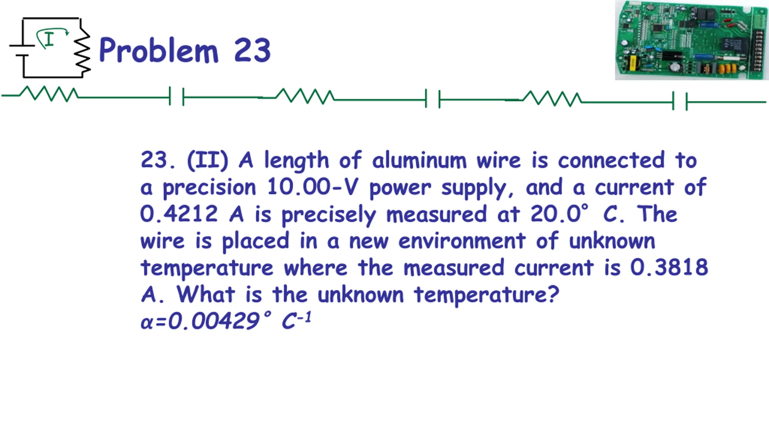 I Problem 23 23. (II) A length of aluminum wire is connected to a precision 10.00-V power supply, and a current of 0.4212 A is precisely measured at 20.0 wire is placed in a new environment of unknown temperature where the measured current is 0.3818 A. What is the unknown temperature? =0.00429 C-1 C. The