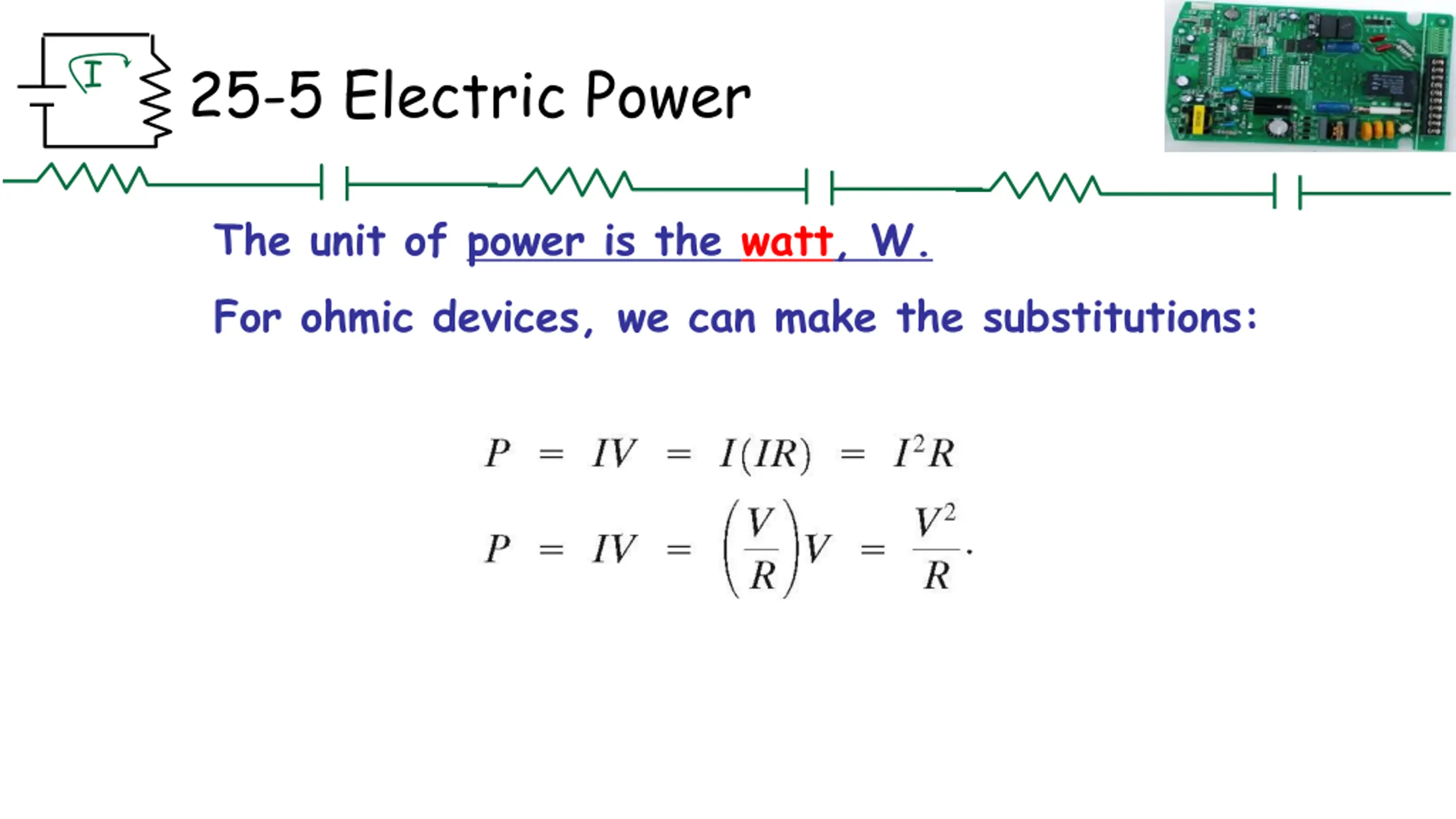 I 25-5 Electric Power The unit of power is the watt, W. For ohmic devices, we can make the substitutions: