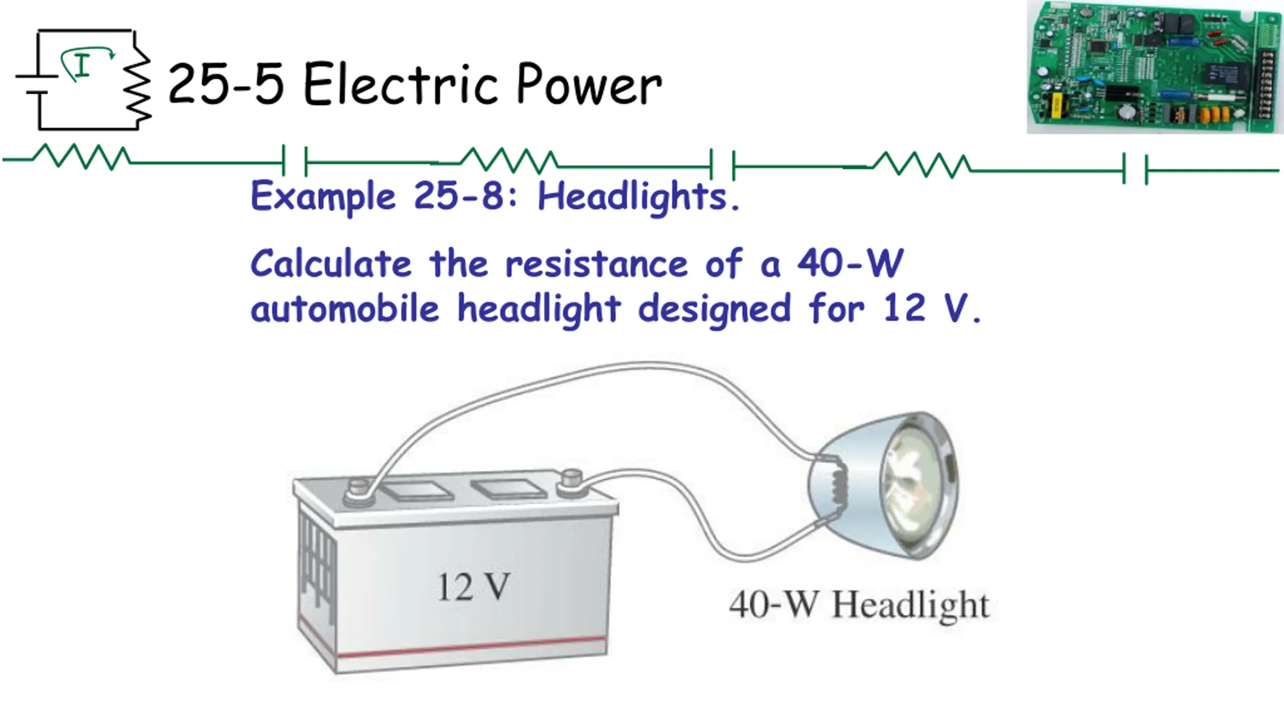I 25-5 Electric Power Example 25-8: Headlights. Calculate the resistance of a 40-W automobile headlight designed for 12 V.