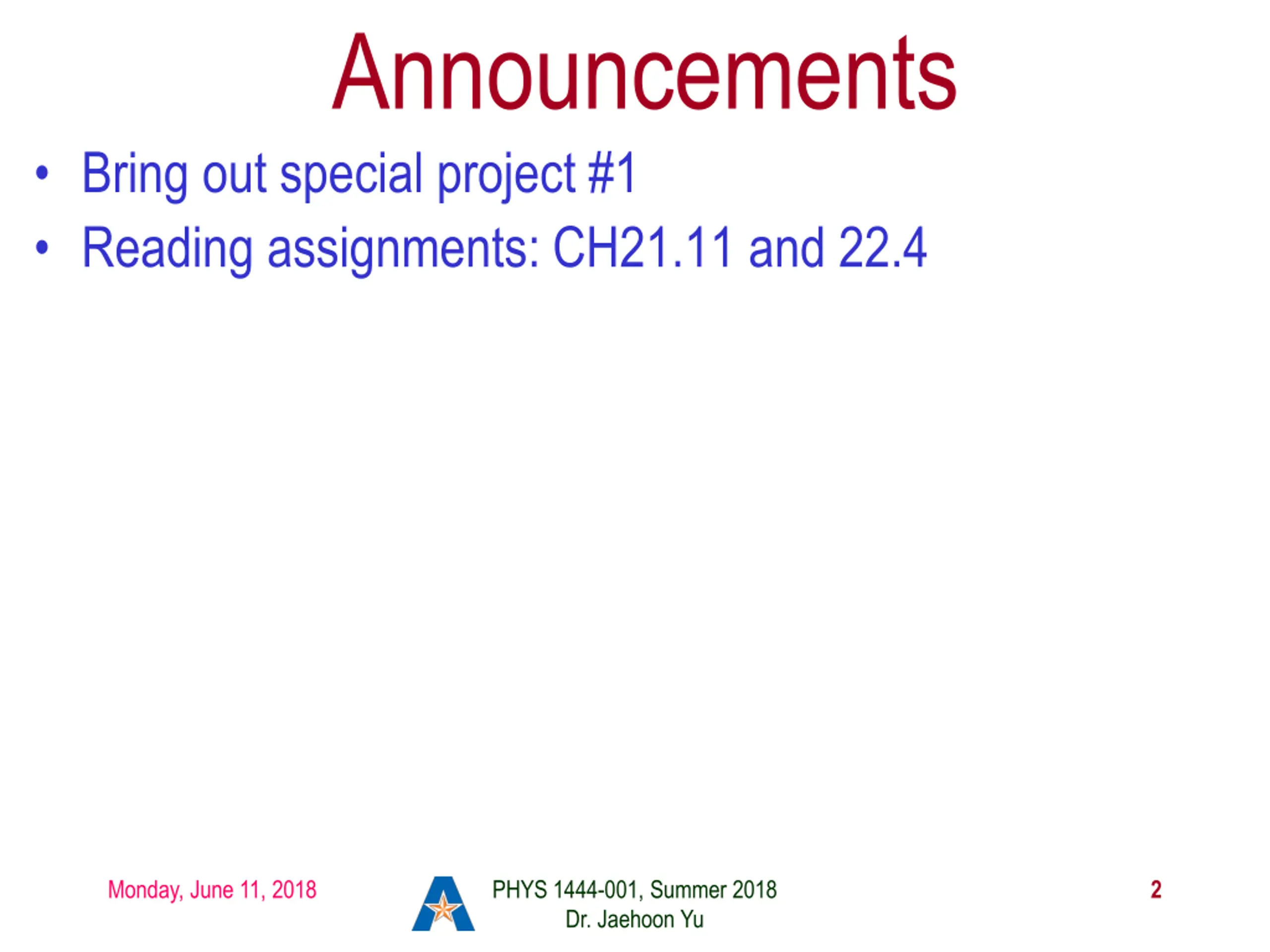 Announcements Bring out special project #1 Reading assignments: CH21.11 and 22.4 Monday, June 11, 2018 PHYS 1444-001, Summer 2018 Dr. Jaehoon Yu 2
