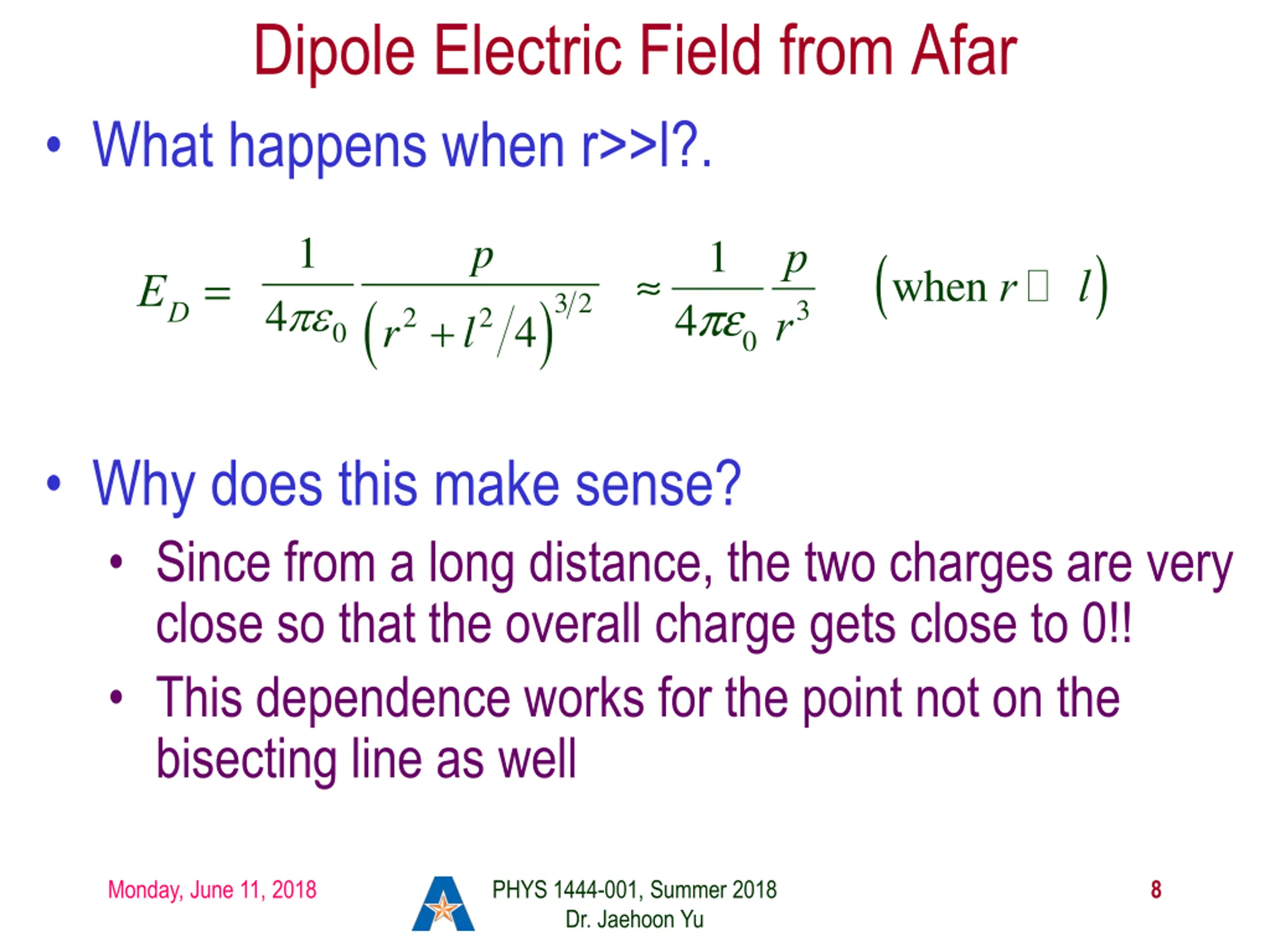 Dipole Electric Field from Afar What happens when r>>l?. 1 p ( ) 1 p r3 when r ED= l ( ) 3 2 4pe0 4 2 2 + 4 r l 0 Why does this make sense? Since from a long distance, the two charges are very close so that the overall charge gets close to 0!! This dependence works for the point not on the bisecting line as well Monday, June 11, 2018 PHYS 1444-001, Summer 2018 Dr. Jaehoon Yu 8