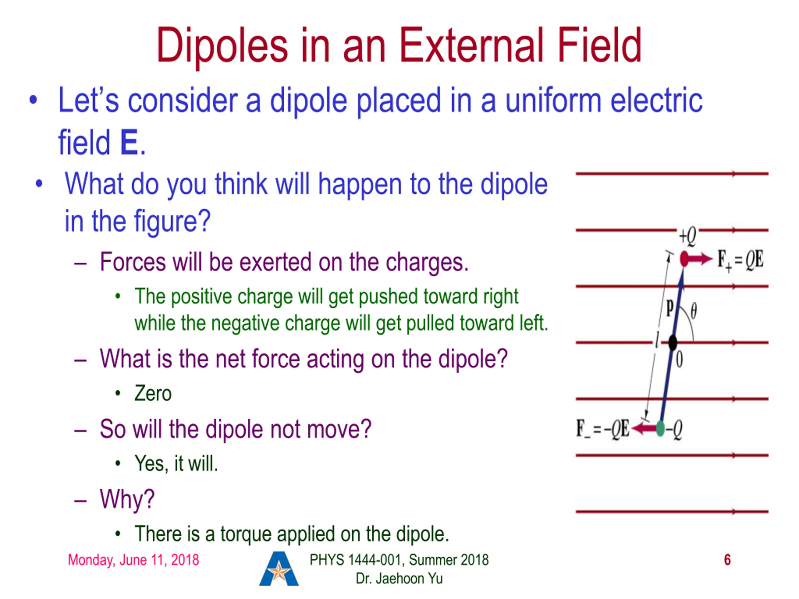 Dipoles in an External Field Let s consider a dipole placed in a uniform electric field E. What do you think will happen to the dipole in the figure? Forces will be exerted on the charges. The positive charge will get pushed toward right while the negative charge will get pulled toward left. What is the net force acting on the dipole? Zero So will the dipole not move? Yes, it will. Why? There is a torque applied on the dipole. Monday, June 11, 2018 PHYS 1444-001, Summer 2018 Dr. Jaehoon Yu 6