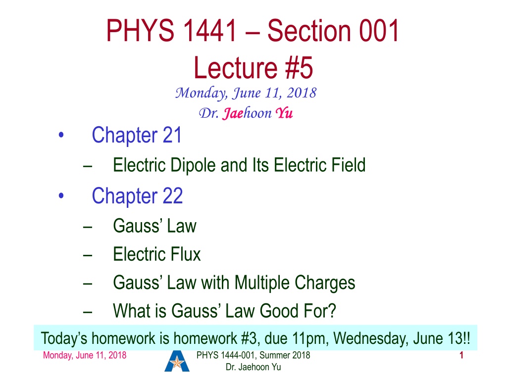 PHYS 1441 Section 001 Lecture #5 Monday, June 11, 2018 Dr. Jae Jaehoon Yu Chapter 21 Electric Dipole and Its Electric Field Chapter 22 Gauss Law Electric Flux Gauss Law with Multiple Charges What is Gauss Law Good For? Today s homework is homework #3, due 11pm, Wednesday, June 13!! Yu Monday, June 11, 2018 PHYS 1444-001, Summer 2018 Dr. Jaehoon Yu 1