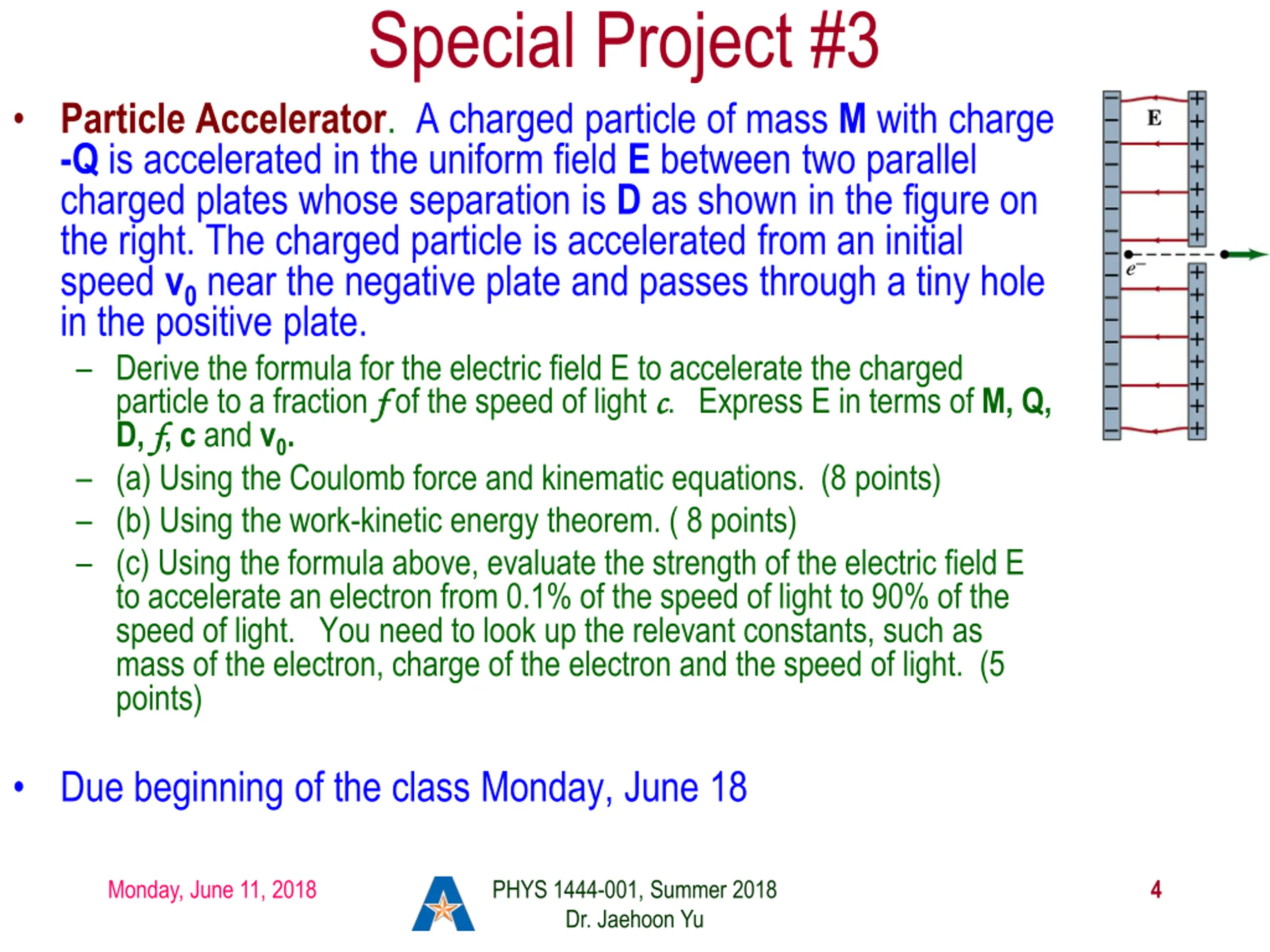 Special Project #3 Particle Accelerator. A charged particle of mass M with charge -Q is accelerated in the uniform field E between two parallel charged plates whose separation is D as shown in the figure on the right. The charged particle is accelerated from an initial speed v0 near the negative plate and passes through a tiny hole in the positive plate. Derive the formula for the electric field E to accelerate the charged particle to a fraction f fof the speed of light c c. Express E in terms of M, Q, D, f f, c and v0. (a) Using the Coulomb force and kinematic equations. (8 points) (b) Using the work-kinetic energy theorem. ( 8 points) (c) Using the formula above, evaluate the strength of the electric field E to accelerate an electron from 0.1% of the speed of light to 90% of the speed of light. You need to look up the relevant constants, such as mass of the electron, charge of the electron and the speed of light. (5 points) Due beginning of the class Monday, June 18 Monday, June 11, 2018 PHYS 1444-001, Summer 2018 Dr. Jaehoon Yu 4