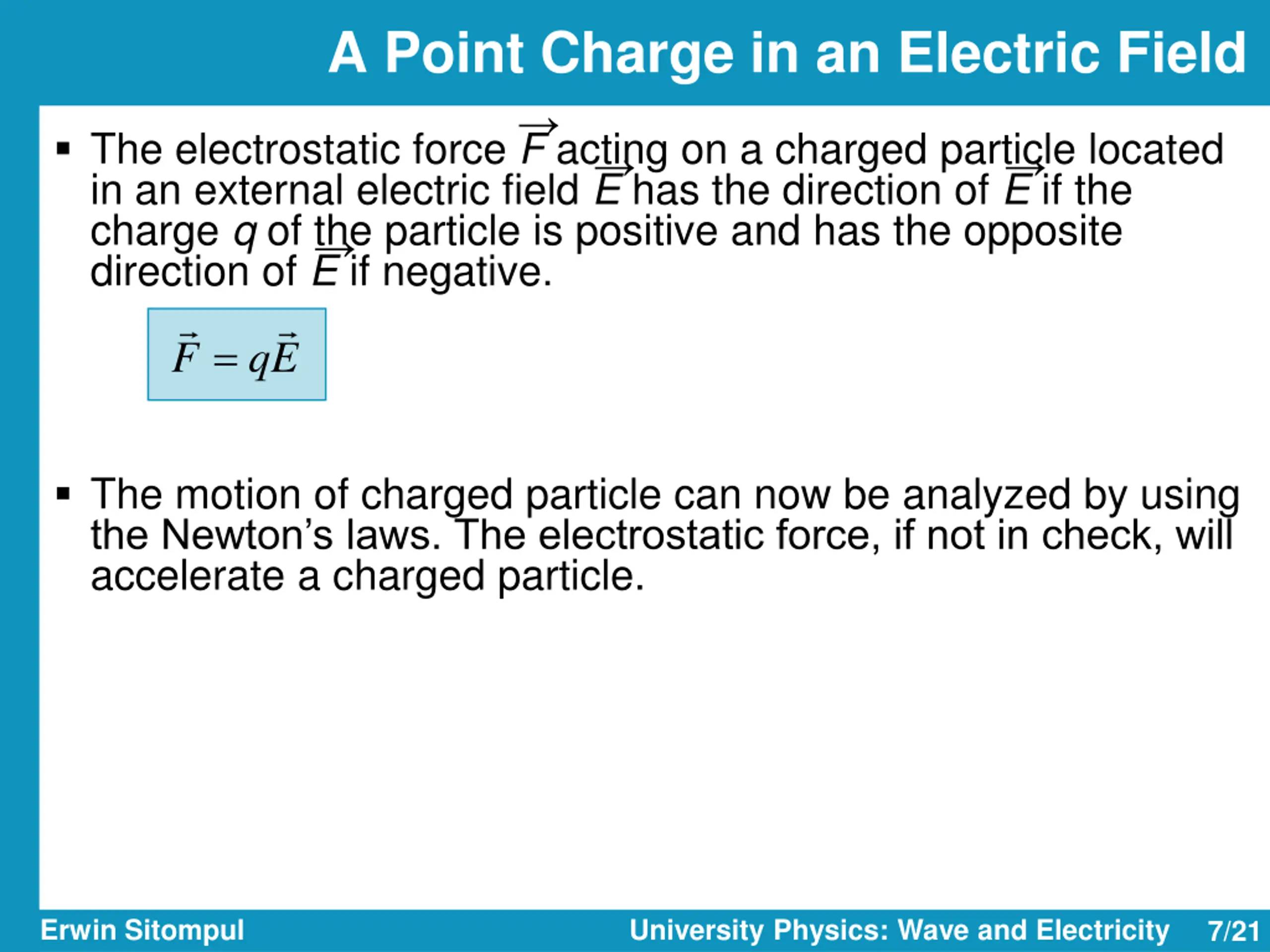 A Point Charge in an Electric Field The electrostatic force F acting on a charged particle located in an external electric field E has the direction of E if the charge q of the particle is positive and has the opposite direction of E if negative. = F qE The motion of charged particle can now be analyzed by using the Newton s laws. The electrostatic force, if not in check, will accelerate a charged particle. Erwin Sitompul University Physics: Wave and Electricity 7/21