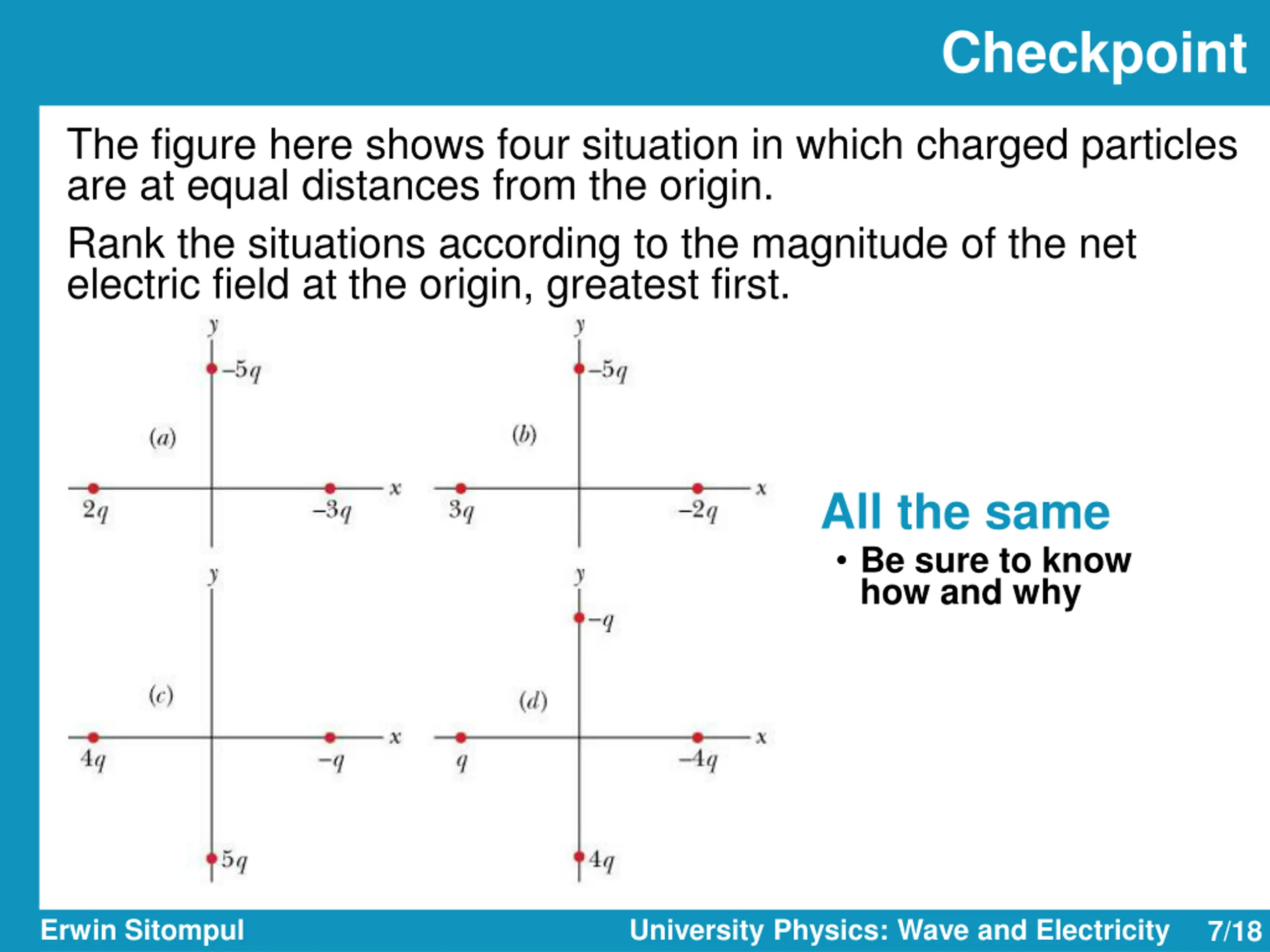 Checkpoint The figure here shows four situation in which charged particles are at equal distances from the origin. Rank the situations according to the magnitude of the net electric field at the origin, greatest first. All the same Be sure to know how and why Erwin Sitompul University Physics: Wave and Electricity 7/18