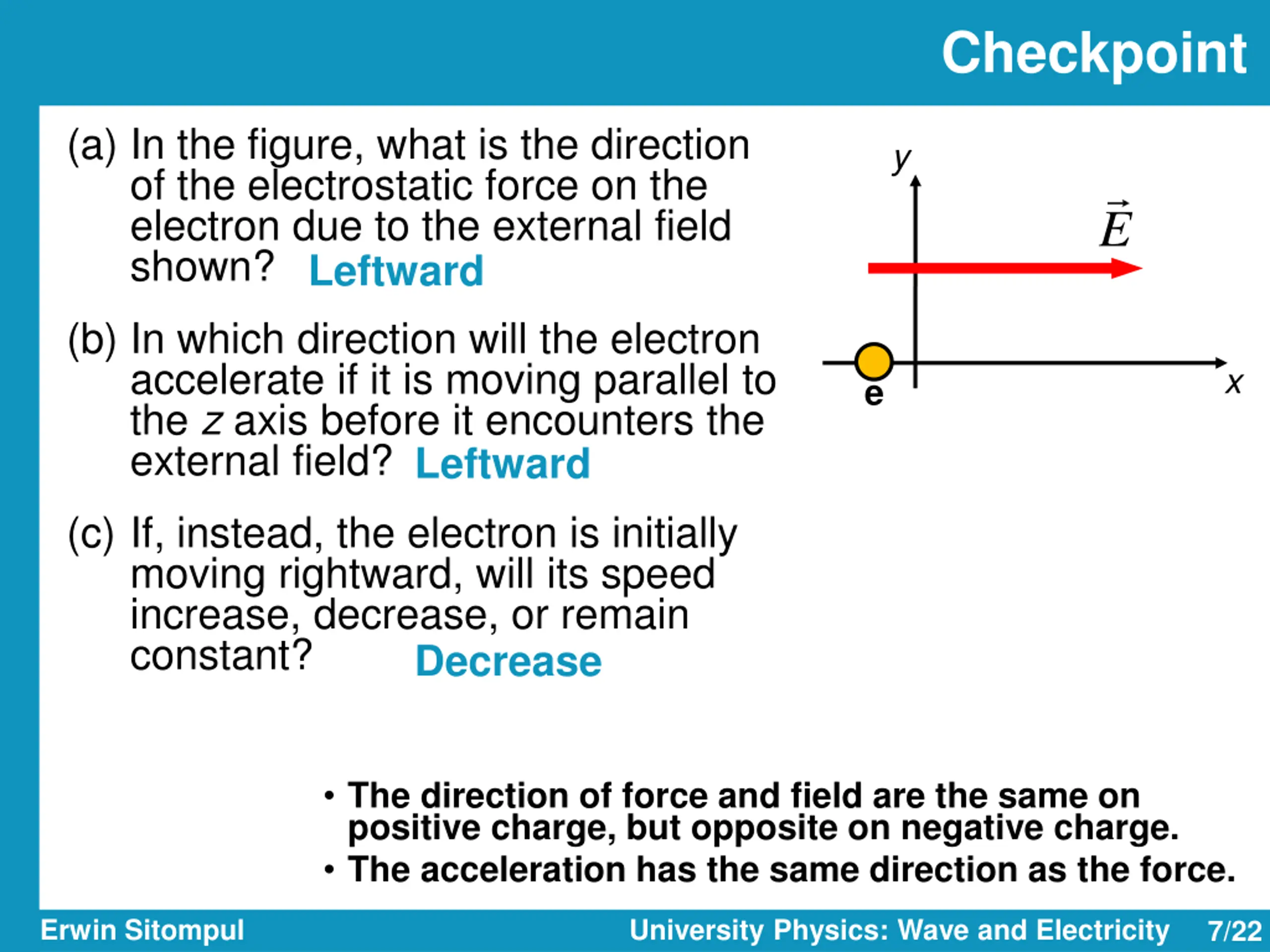 Checkpoint (a) In the figure, what is the direction of the electrostatic force on the electron due to the external field shown? Leftward y E (b) In which direction will the electron accelerate if it is moving parallel to the z axis before it encounters the external field? Leftward x e (c) If, instead, the electron is initially moving rightward, will its speed increase, decrease, or remain constant? Decrease The direction of force and field are the same on positive charge, but opposite on negative charge. The acceleration has the same direction as the force. Erwin Sitompul University Physics: Wave and Electricity 7/22