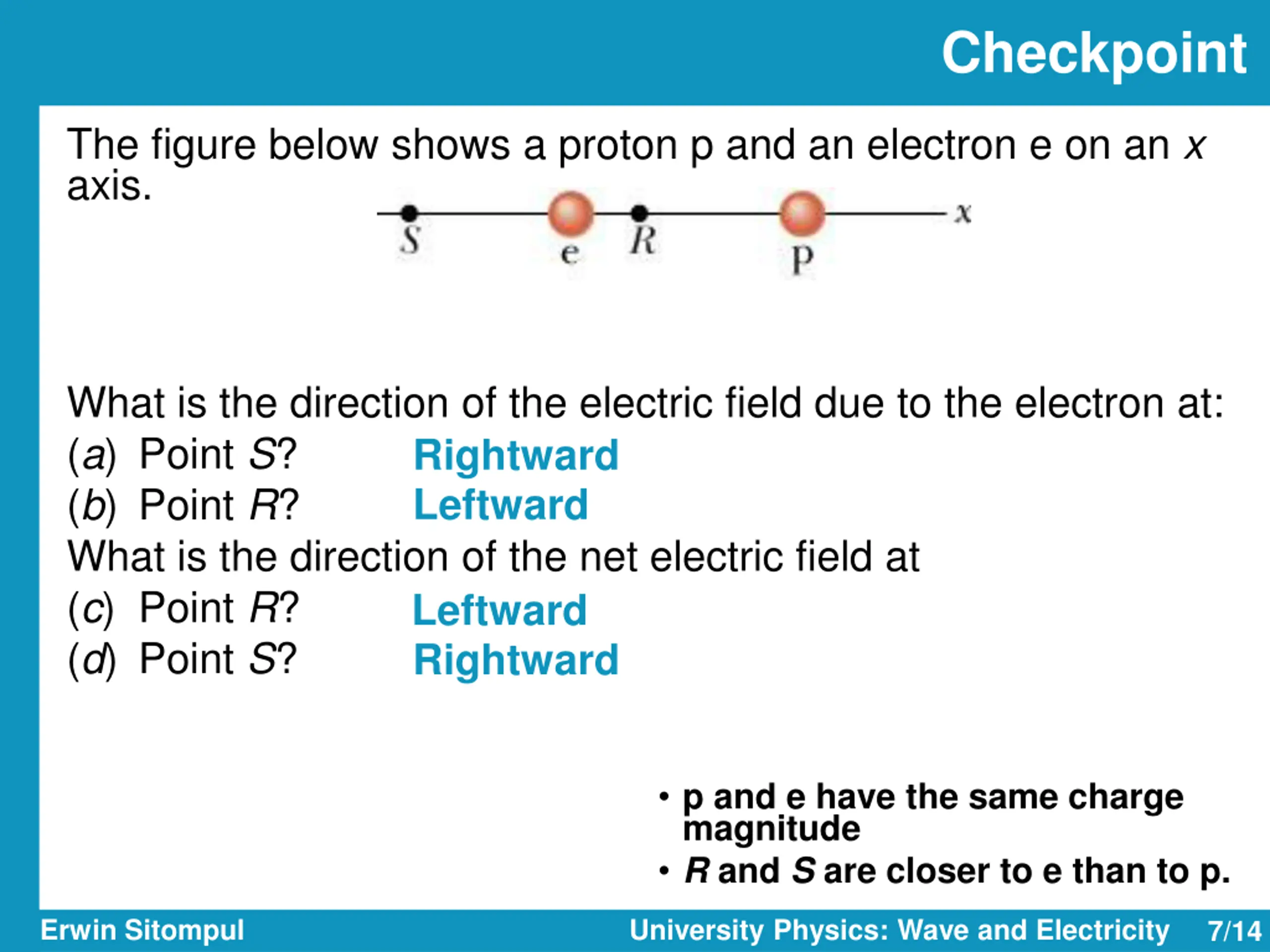 Checkpoint The figure below shows a proton p and an electron e on an x axis. What is the direction of the electric field due to the electron at: (a) Point S? (b) Point R? What is the direction of the net electric field at (c) Point R? (d) Point S? Rightward Rightward Leftward Leftward p and e have the same charge magnitude R and S are closer to e than to p. Erwin Sitompul University Physics: Wave and Electricity 7/14