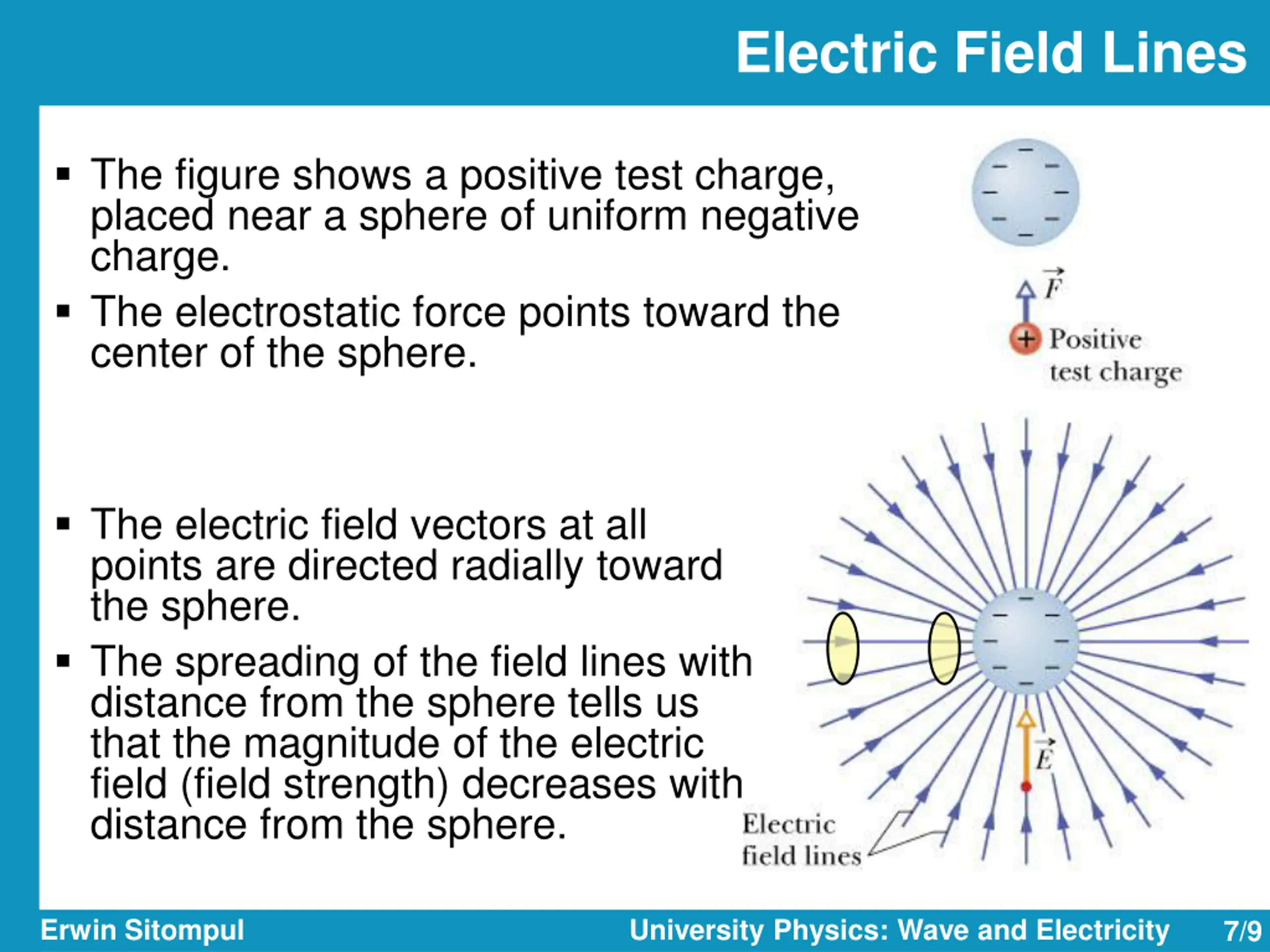 Electric Field Lines The figure shows a positive test charge, placed near a sphere of uniform negative charge. The electrostatic force points toward the center of the sphere. The electric field vectors at all points are directed radially toward the sphere. The spreading of the field lines with distance from the sphere tells us that the magnitude of the electric field (field strength) decreases with distance from the sphere. Erwin Sitompul University Physics: Wave and Electricity 7/9