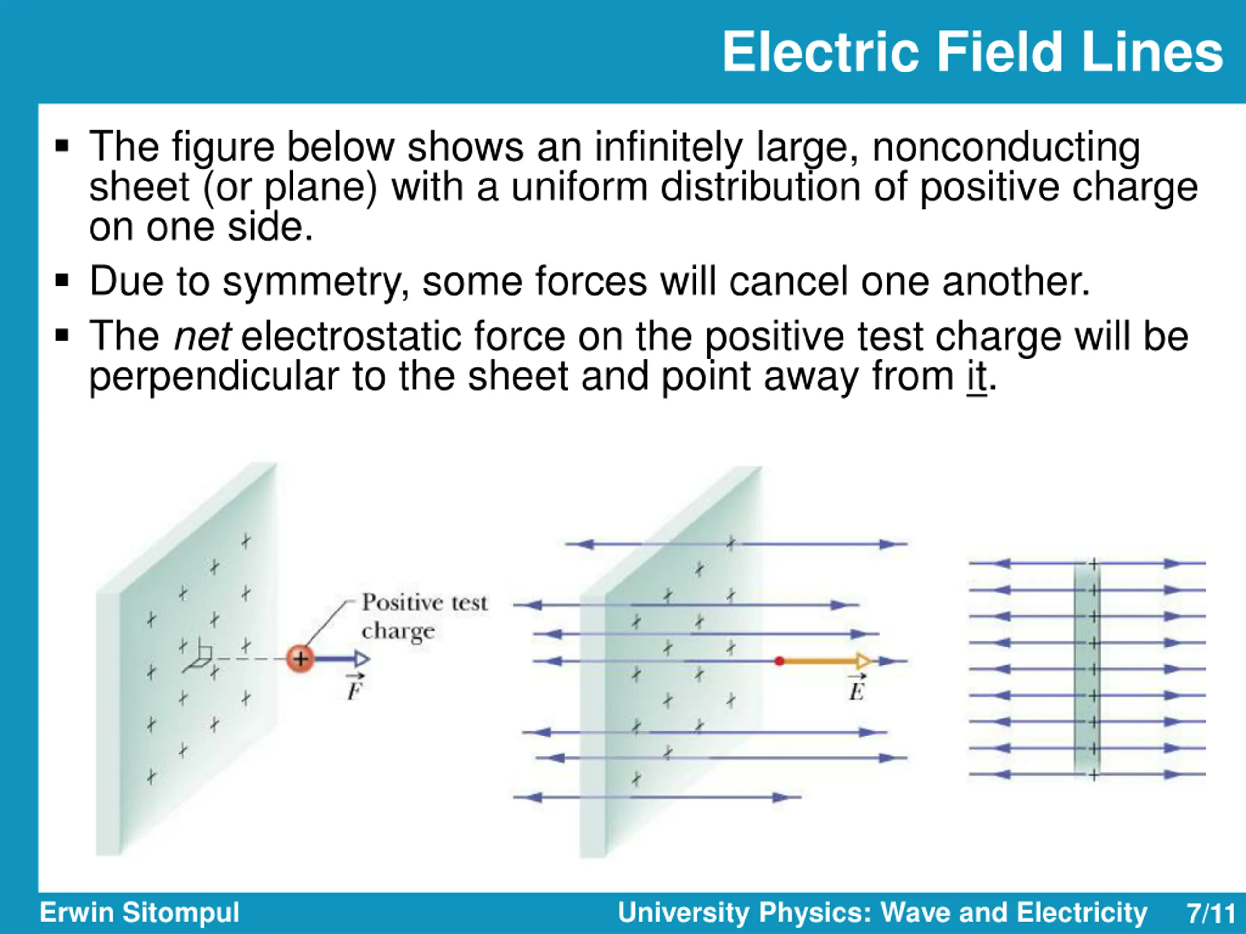 Electric Field Lines The figure below shows an infinitely large, nonconducting sheet (or plane) with a uniform distribution of positive charge on one side. Due to symmetry, some forces will cancel one another. The net electrostatic force on the positive test charge will be perpendicular to the sheet and point away from it. Erwin Sitompul University Physics: Wave and Electricity 7/11