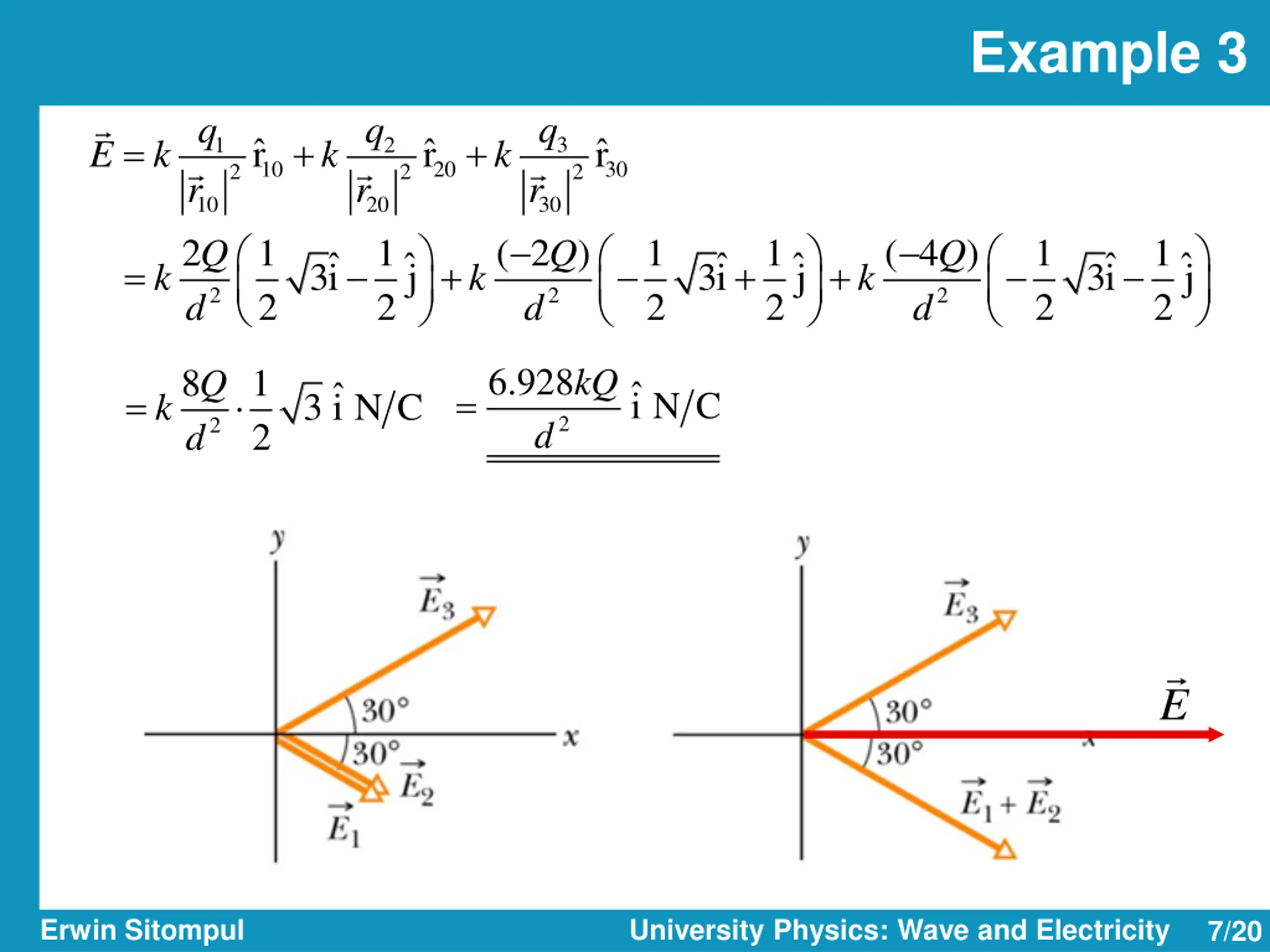 Example 3 q q q = + + 10 r 20 r 30 r 3 1 2 E k k k 2 2 2 10 r 2 d 20 r 30 r 1 2 1 2 ( 2 ) d 1 2 1 2 ( 4 ) d 1 2 1 2 Q Q Q j j j = + + + 3i 3i 3i k k k 2 2 2 6.928 kQ 8 1 2 Q i N C = = 3 i N C kd 2 2 d E Erwin Sitompul University Physics: Wave and Electricity 7/20