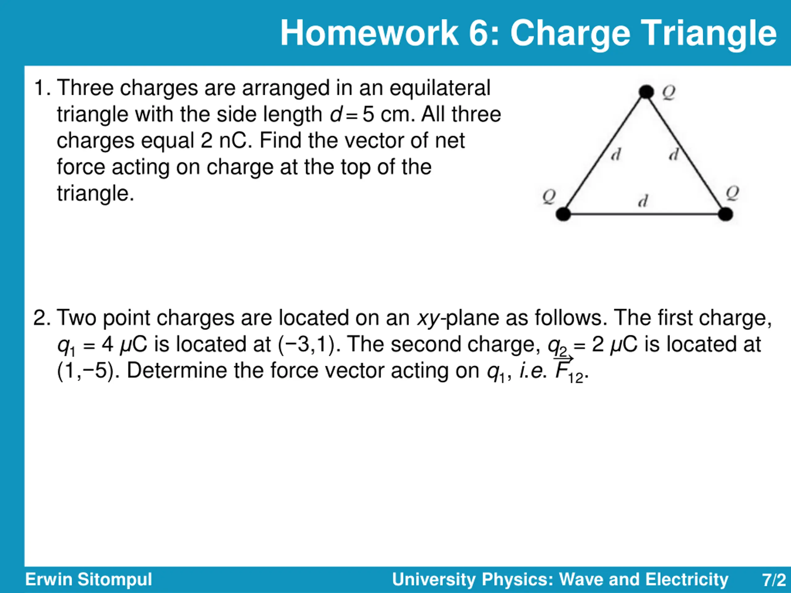 Homework 6: Charge Triangle 1. Three charges are arranged in an equilateral triangle with the side length d=5 cm. All three charges equal 2 nC. Find the vector of net force acting on charge at the top of the triangle. 2. Two point charges are located on an xy-plane as follows. The first charge, q1 = 4 C is located at ( 3,1). The second charge, q2 = 2 C is located at (1, 5). Determine the force vector acting on q1, i.e. F12. Erwin Sitompul University Physics: Wave and Electricity 7/2