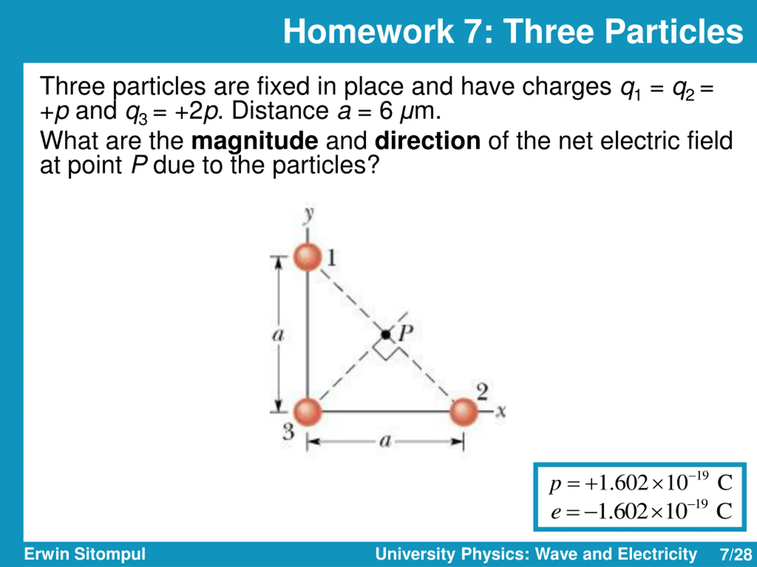Homework 7: Three Particles Three particles are fixed in place and have charges q1 = q2 = +p and q3 = +2p. Distance a = 6 m. What are the magnitude and direction of the net electric field at point P due to the particles? 1.602 10 = + 1.602 10 = 19 C C p e 19 Erwin Sitompul University Physics: Wave and Electricity 7/28