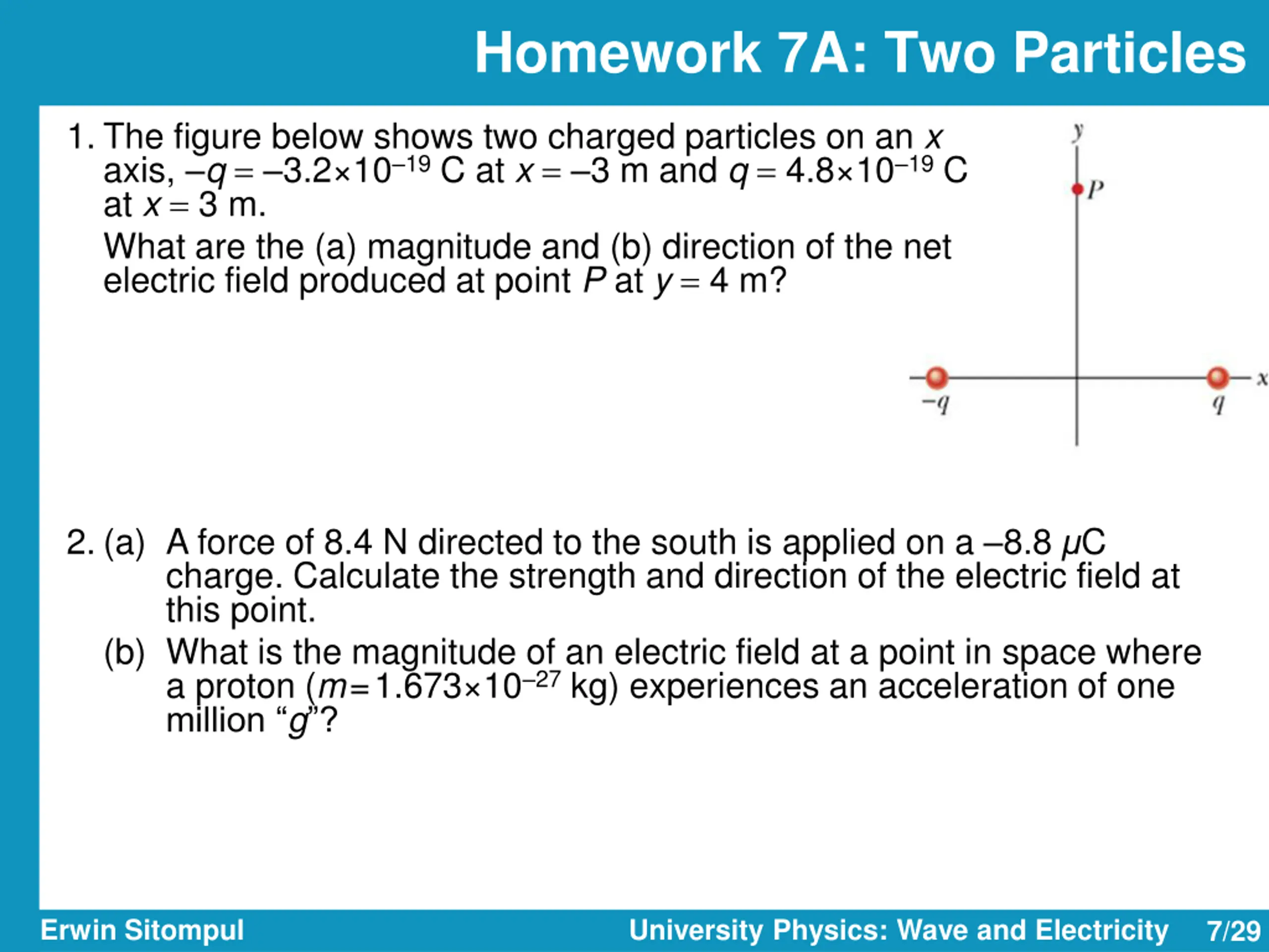 Homework 7A: Two Particles 1. The figure below shows two charged particles on an x axis, q= 3.2 10 19 C at x= 3 m and q= 4.8 10 19 C at x= 3 m. What are the (a) magnitude and (b) direction of the net electric field produced at point P at y= 4 m? 2. (a) A force of 8.4 N directed to the south is applied on a 8.8 C charge. Calculate the strength and direction of the electric field at this point. (b) What is the magnitude of an electric field at a point in space where a proton (m=1.673 10 27 kg) experiences an acceleration of one million g ? Erwin Sitompul University Physics: Wave and Electricity 7/29