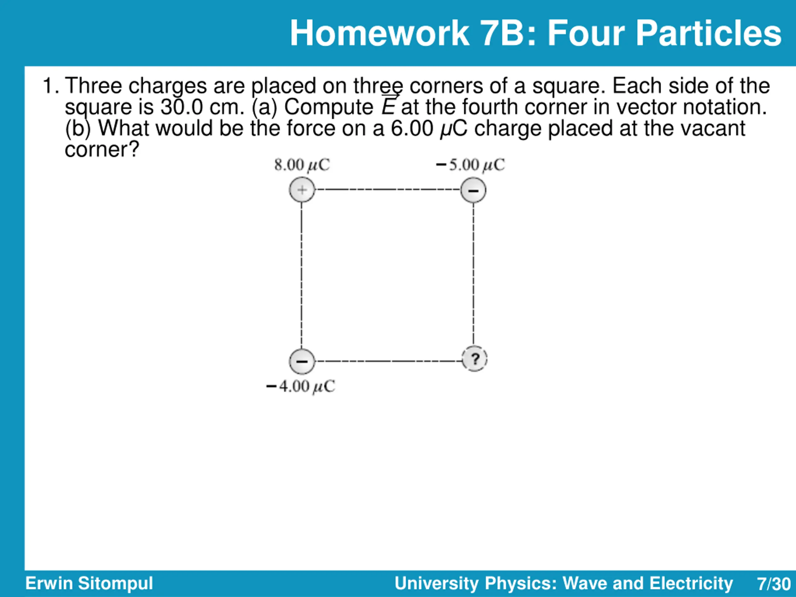 Homework 7B: Four Particles 1. Three charges are placed on three corners of a square. Each side of the square is 30.0 cm. (a) Compute E at the fourth corner in vector notation. (b) What would be the force on a 6.00 C charge placed at the vacant corner? Erwin Sitompul University Physics: Wave and Electricity 7/30