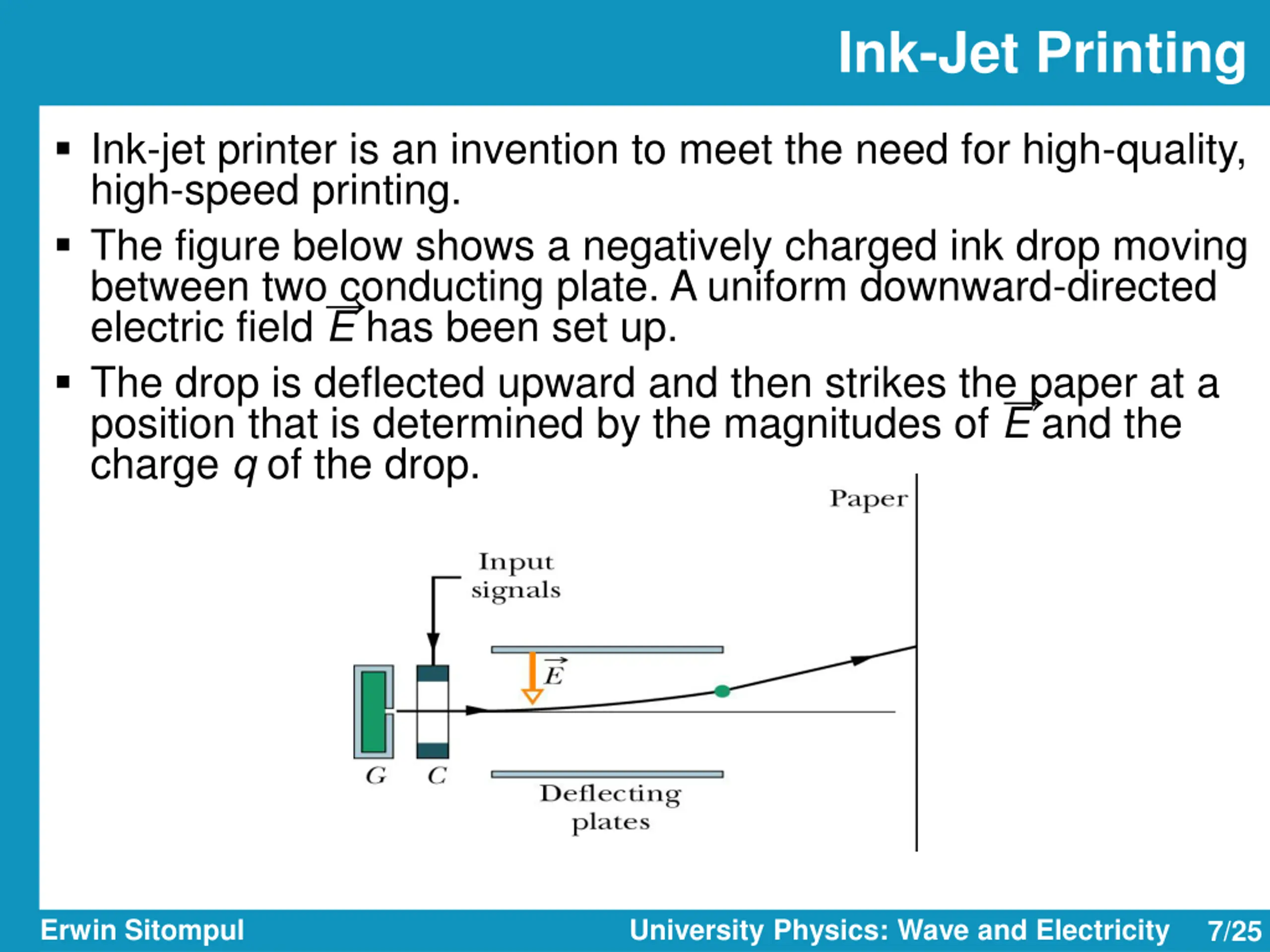 Ink-Jet Printing Ink-jet printer is an invention to meet the need for high-quality, high-speed printing. The figure below shows a negatively charged ink drop moving between two conducting plate. A uniform downward-directed electric field E has been set up. The drop is deflected upward and then strikes the paper at a position that is determined by the magnitudes of E and the charge q of the drop. Erwin Sitompul University Physics: Wave and Electricity 7/25