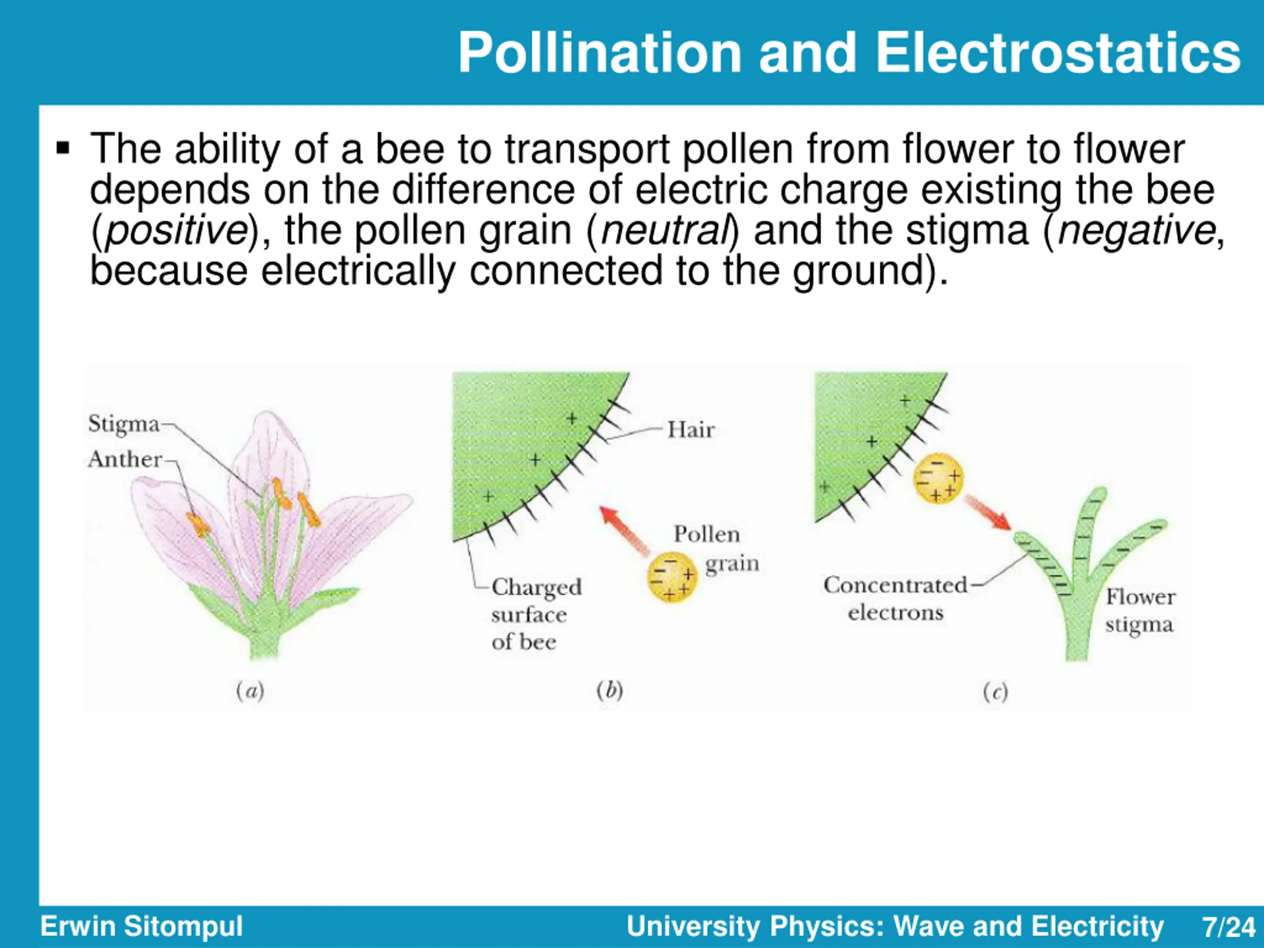 Pollination and Electrostatics The ability of a bee to transport pollen from flower to flower depends on the difference of electric charge existing the bee (positive), the pollen grain (neutral) and the stigma (negative, because electrically connected to the ground). Erwin Sitompul University Physics: Wave and Electricity 7/24